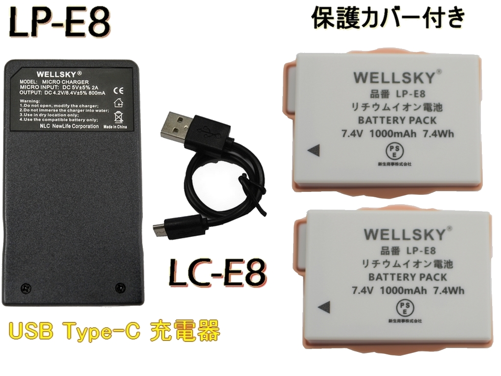 LP-E8 互換バッテリー 2個 + [ 超軽量 ] USB Type-C 互換充電器 バッテリーチャージャー LC-E8 1個 Canon キヤノンイオス EOS