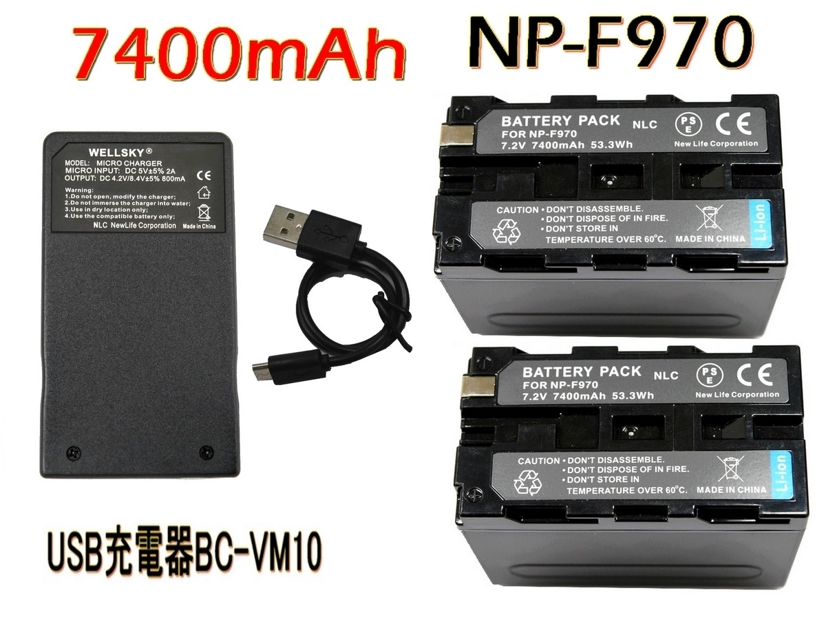NP-F950 NP-F960 NP-F970 互換バッテリー 7400mAh 2個 & 超軽量 USB 急速 互換充電器 バッテリーチャージャー BC-VM10 1個 [ 2点セット ] SONY ソニー
