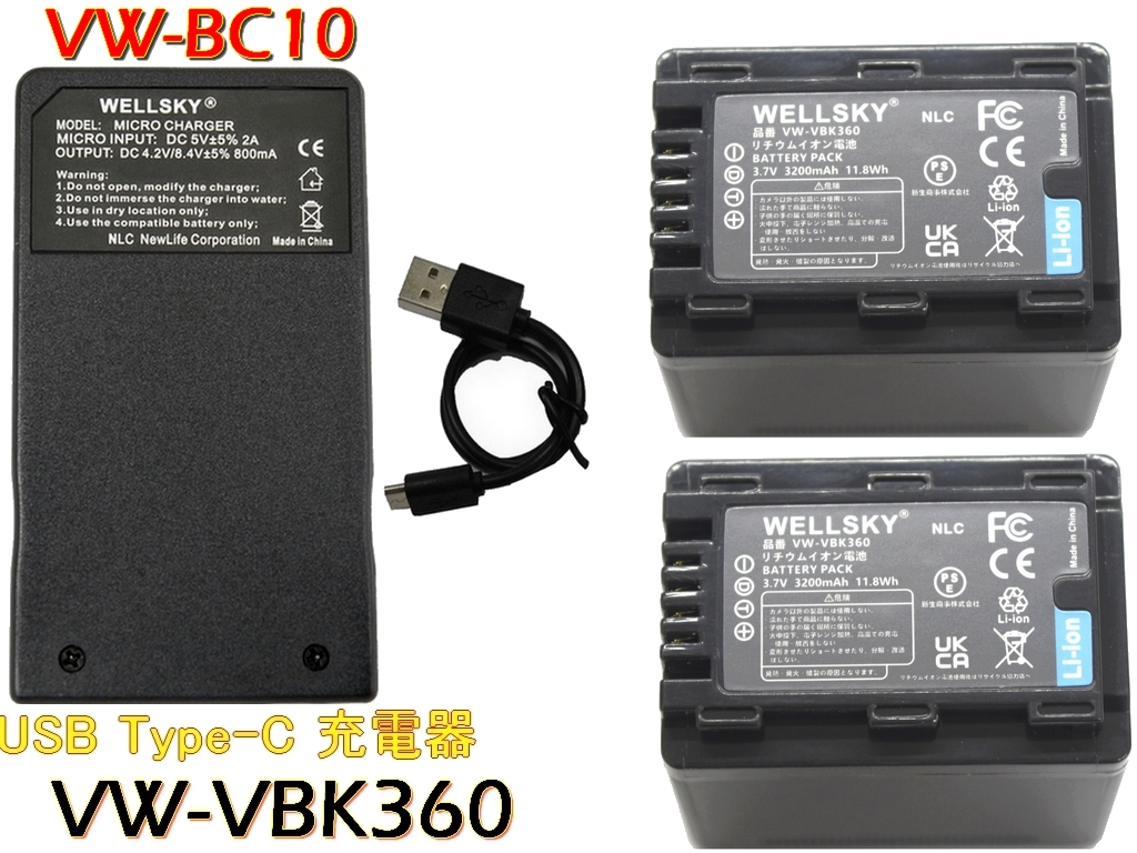 VW-VBK360-K / VW-VBK360 互換バッテリー 2個 + VW-BC10-K / VW-BC10 超軽量 USB TypeC 互換充電器 バッテリーチャージャー 1個 Panasonic パナソニック