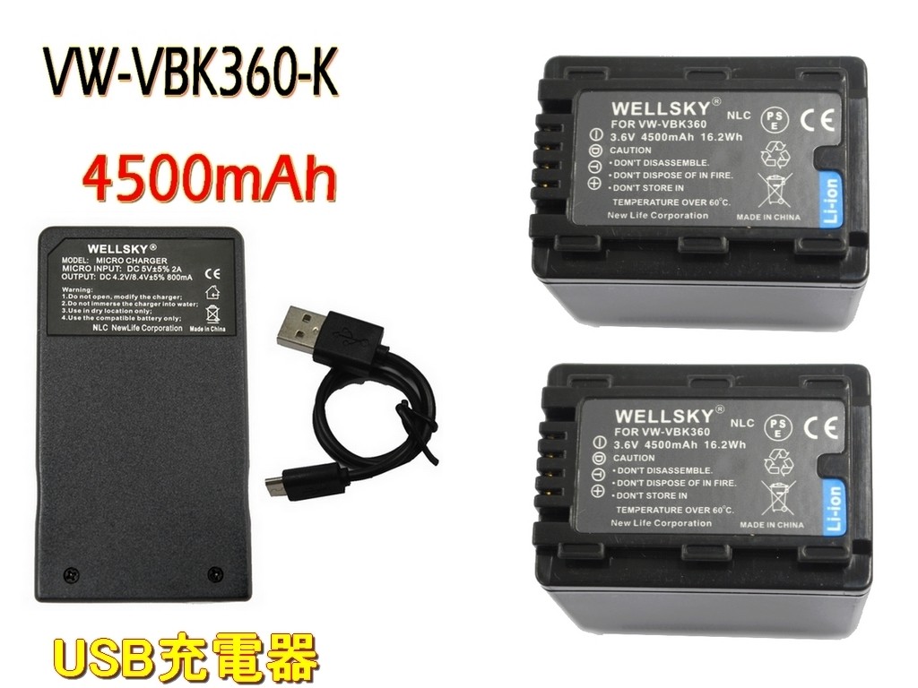 VW-VBK360-K / VW-VBK360 互換バッテリー 2個 + VW-BC10-K / VW-BC10 超軽量 USB TypeC 互換充電器 バッテリーチャージャー 1個 Panasonic パナソニック