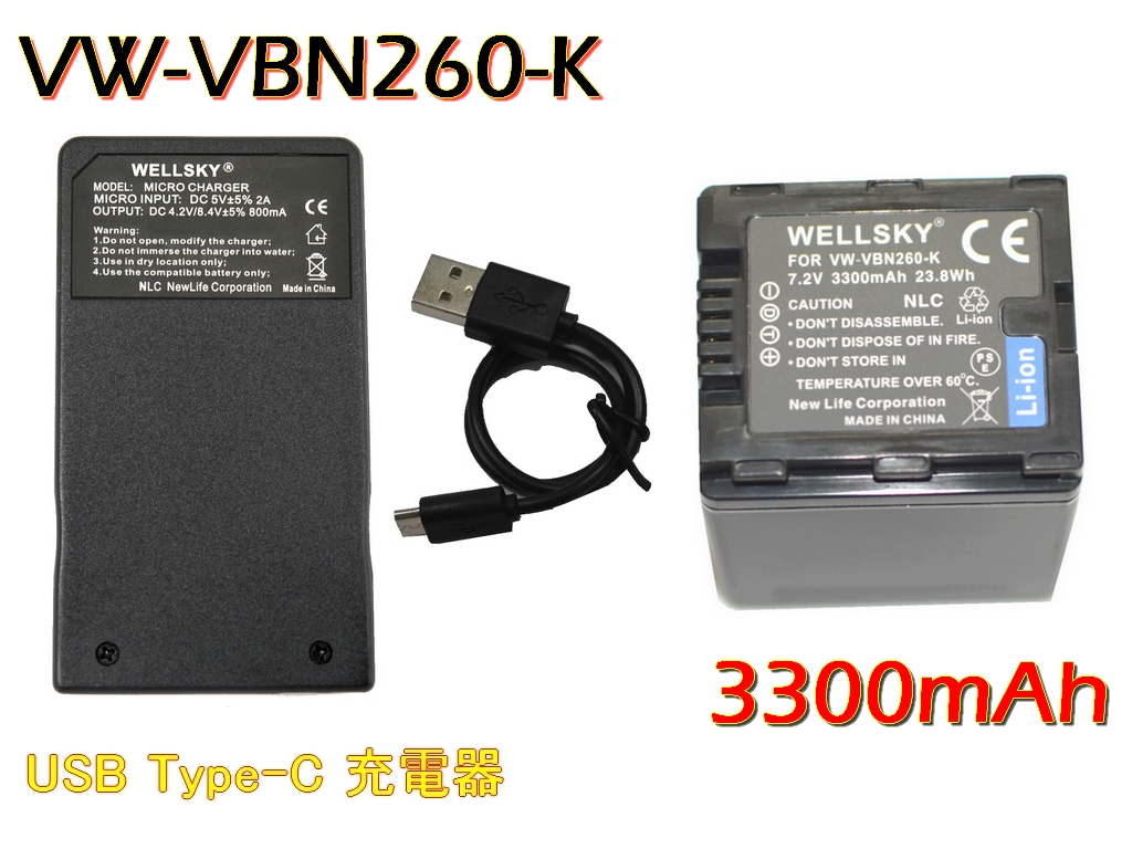 VW-VBN260-K / VW-VBN260 互換バッテリー 1個 + VW-BC20-K / VW-BC20 [ 超軽量 ] USB Type-C 互換充電器 バッテリーチャージャー 1個 Panasonic パナソニック