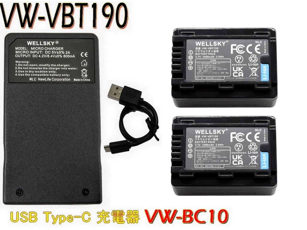 VW-VBT190-K / VW-VBT190 互換バッテリー 2個 + VW-BC10-K / VW-BC10 [ 超軽量 ] USB Type-C 互換充電器 バッテリーチャージャー 1個 Panasonci パナソニック