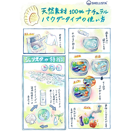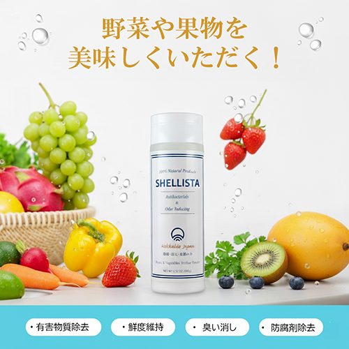 Shellista(シェリスタ)は青森県陸奥湾産の産業廃棄物として廃棄されているホタテ貝殻を独自製法で 加工した天然素材の除菌パウダーです。