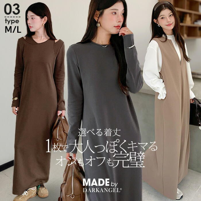 【 選べる3タイプマキシワンピース 】 シンプルだからこそ、こだわりのシルエットで作り上げた、 スムースコットン生地のマキシワンピース。 身長やスタイルに合わせて選べる3丈展開(短め丈・普通丈・ロング丈)で、 低身長さんも高身長さんも美しく着こなせます。 [長袖/ラウンドネック] シンプルなのに、1枚でサマになる。 ミニマルなデザインが大人の女性らしさを引き立てる、 ラウンドネックのマキシワンピース。 [スリーブレス/深めキーネック] レイヤードを楽しむ、大人のためのジャンスカ風ワンピース。 深めのキーネックが顔まわりをすっきり見せ、 重ね着スタイルをより洗練された印象に。 [長袖/レイヤードネック] 首元のカットデザインが目を惹く、モード感漂うレイヤードネックワンピース。 シンプルながらもひとクセあるディテールで、1枚で着映えるデザイン。 《商品ポイント》 [長袖/ラウンドネック] ・上品見えするミニマルデザイン ・ラウンドネックで顔まわりをすっきり演出 [スリーブレス/深めキーネック] ・インナー次第でロングシーズン活躍 ・深めキーネックで抜け感のあるデザイン [長袖/レイヤードネック] ・さりげなく肌見せできるレイヤードネックデザイン 《デザイン・シルエット》 [長袖/ラウンドネック] ・ラウンドネックが程よい抜け感を演出 ・袖口すっきりの長袖デザインで重ね着にも◎ [スリーブレス/深めキーネック] ・深めのVカットでレイヤード映えするネックライン [長袖/レイヤードネック] ・肩開きデザインがアクセント ・ラウンドネックベースの抜け感あるネックライン 《コーディネート提案》 ・ロングコートを羽織ってモードに ・ブーツ合わせで冬のきれいめカジュアル ・スニーカーと合わせてデイリーに着回し ・アクセサリーで華やかにドレスアップも ・ジャケットを羽織ればきちんと感アップ ・(スリーブレス/深めキーネック)シャツやタートルを合わせて通勤コーデに ・(スリーブレス/深めキーネック)ロンTやスウェットと合わせてカジュアルにも◎ 《サイズ・カラーバリエーション》 カラー:長袖/ラウンドネック…杢グレー / グレイッシュベージュ / チャコール / ブラウン / ブラック / カーキブラウン / ボルドー スリーブレス/深めキーネック…杢グレー / チャコール / ブラウン / ブラック / モカ / ボルドー 長袖/レイヤードネック…杢グレー / チャコール / ブラウン / ブラック / カーキブラウン / モカ サイズ:短め丈-M / 短め丈-L / 普通丈-M / 普通丈-L / 長め丈-M / 長め丈-L " 《素材・機能性》 ・素材:コットン80%、ポリエステル20% ・透け感:ほとんど透けない ・伸縮性:若干あり ・厚み:普通 |