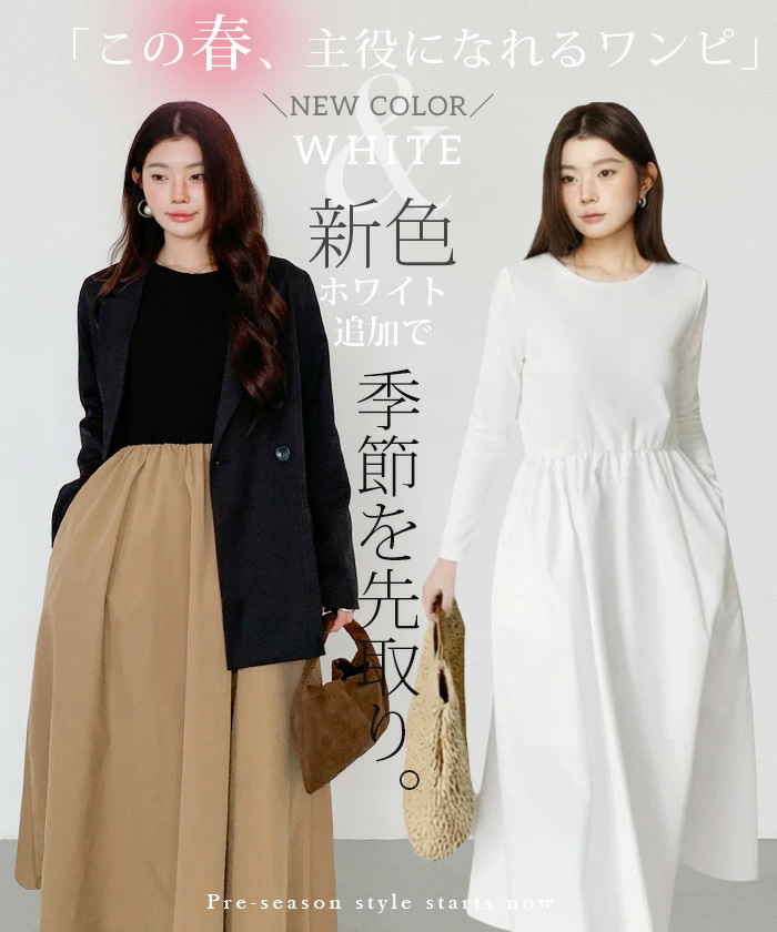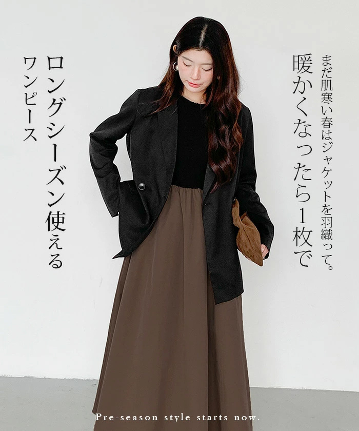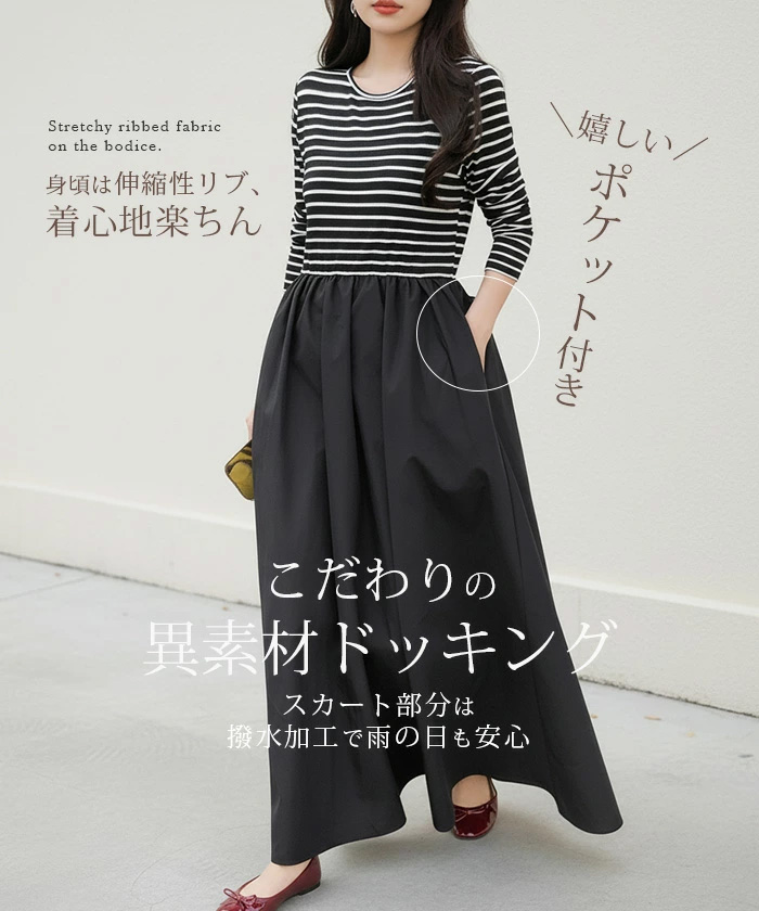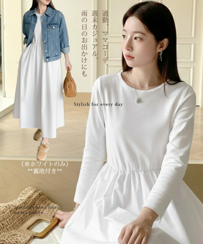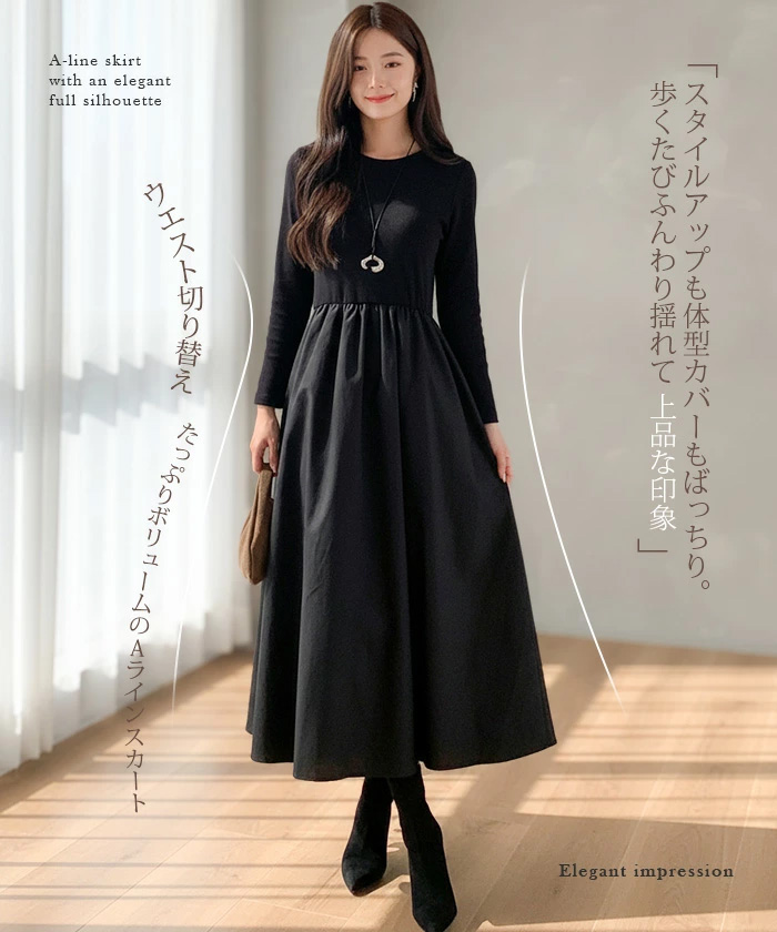 ウエスト切替とAラインシルエットで、体型カバーも自然に叶います。