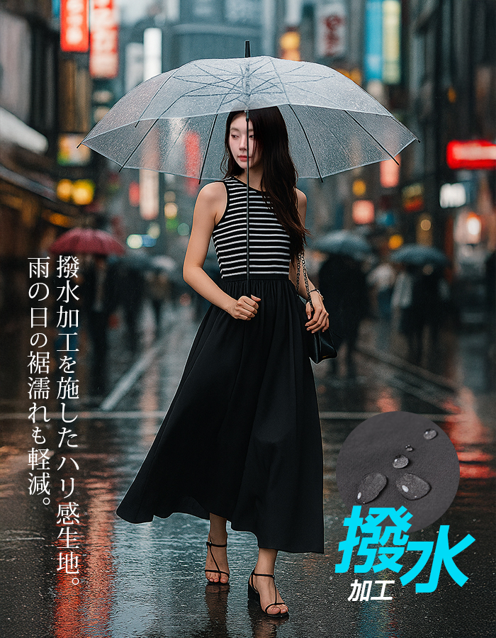 スカート部分はハリのある撥水加工生地で、水をはじいて雨の日も安心。
