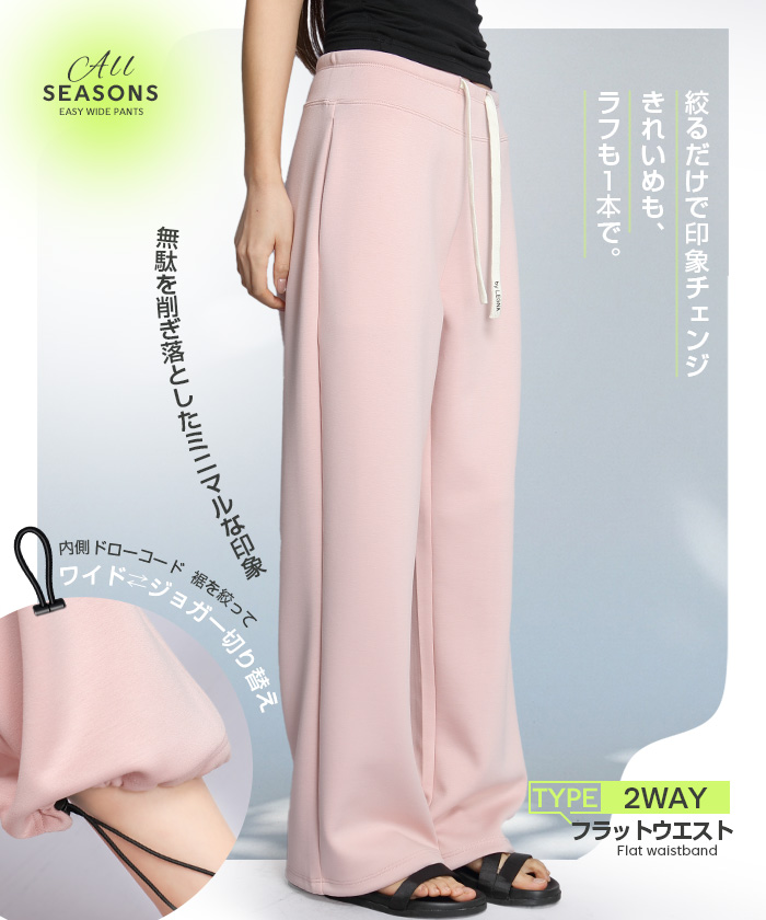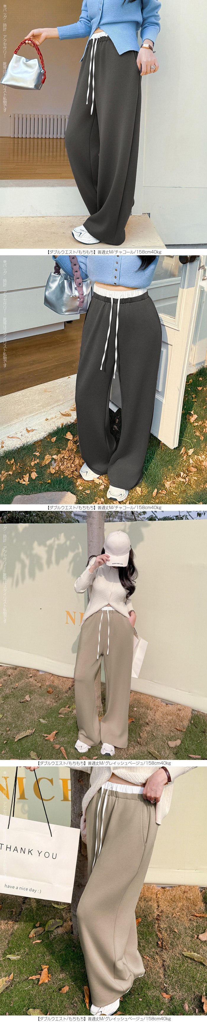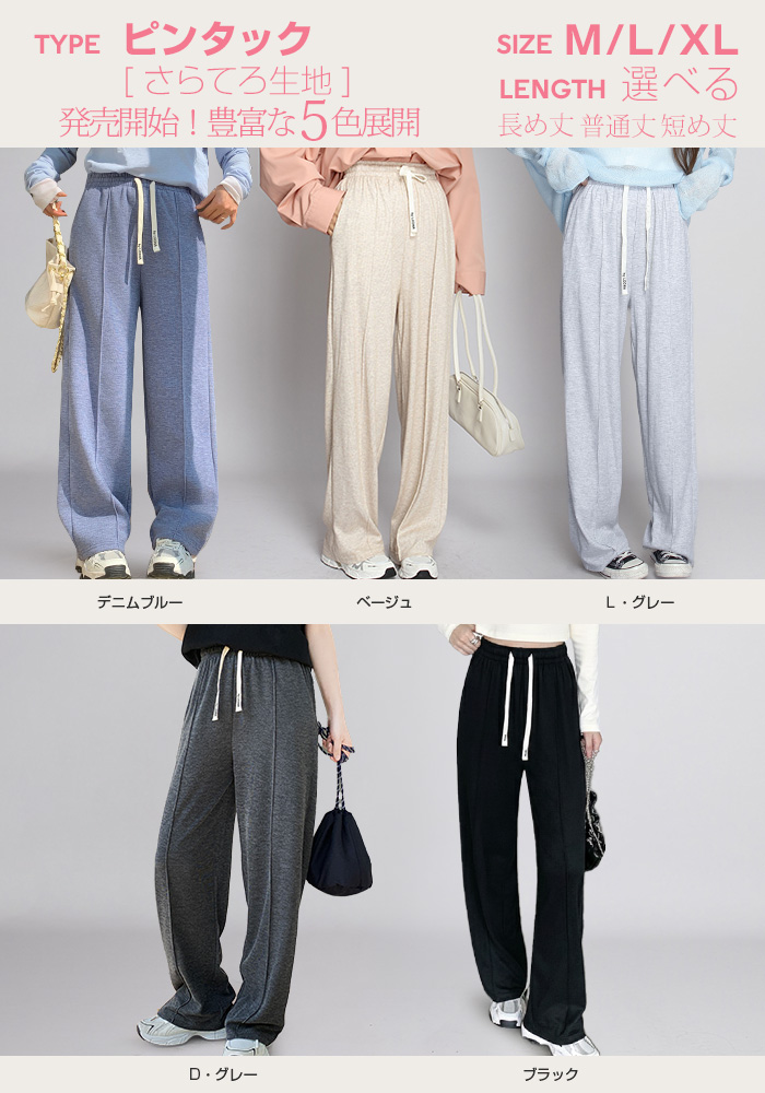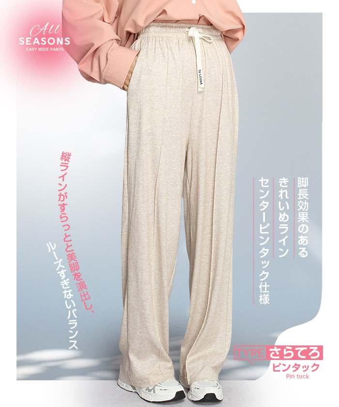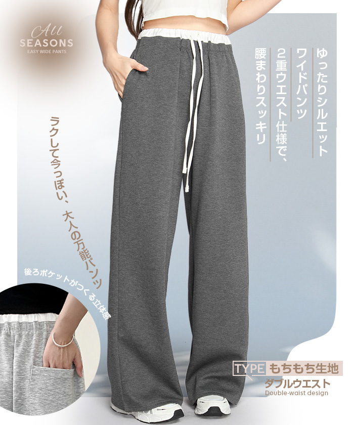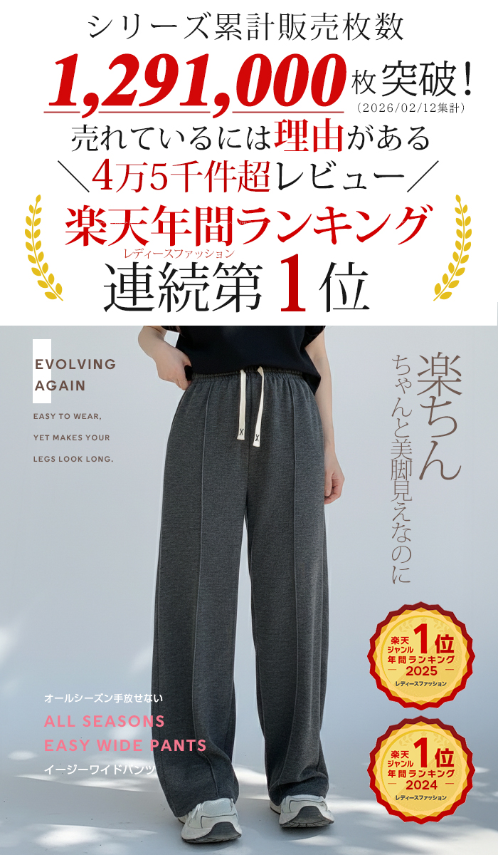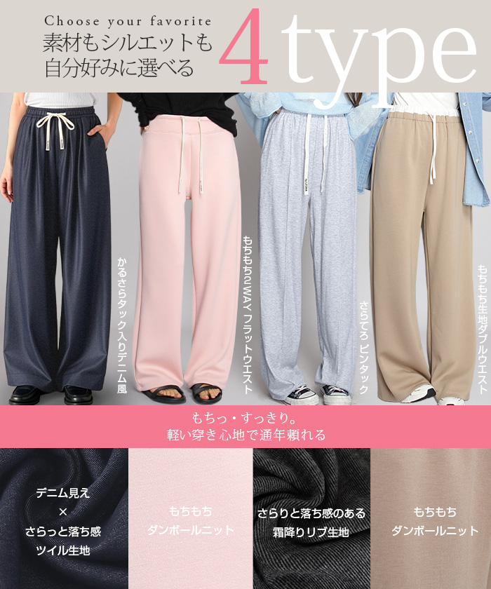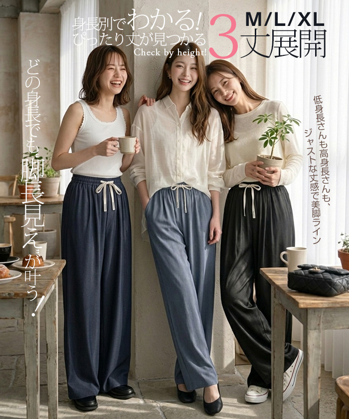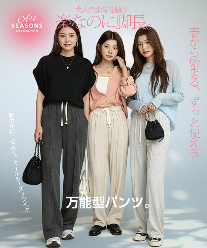 【 選べる丈&素材タイプイージーワイドパンツ 】 人気のイージーワイドパンツ。 もちもち素材の2way、フラットウエストですっきり穿けるタイプ、 もちもち素材にダブルウエストデザインのレイヤード風タイプ、 やわらかもちもちリブ素材、ピンタックデザインタイプ タック入りデニム風のかるさら素材など、選べるデザイン展開。 楽ちんなのにだらしなく見えず、ワンマイルウェアとしても活躍。 1枚持っておくと便利なデイリーアイテムです。 《商品ポイント》 ・2wayフラットウエスト / もちもち フラットウエストでスッキリした印象。 裾のドローコードでワイド→ジョガーの2wayシルエットが楽しめます。 ・ダブルウエスト / もちもち レイヤード風のダブルウエストデザインで、トレンド感のあるカジュアルスタイルに。 ・ピンタック / さらてろ センターピンタック入りで脚をまっすぐきれいに見せる美脚デザイン。 ・タック入りデニム風 / かるさら フロントタック入りで立体感のあるシルエット。 デニム風の見た目ながら軽くさらっとした着心地が魅力。 《デザイン》 ワイドストレートシルエットで脚のラインを拾いにくく、体型カバーにも◎。 柔らかく落ち感のある素材で、動くたびきれいなシルエットを演出します。 《コーディネート》 カジュアル:Tシャツやスウェット+スニーカーでデイリーに。 きれいめ:シャツやブラウスをタックインして大人コーデに。 スポーティ:キャップやナイロンジャケットでアクティブに。 ワンマイル:ラフだけどこなれ感のあるスタイルにも◎。 |