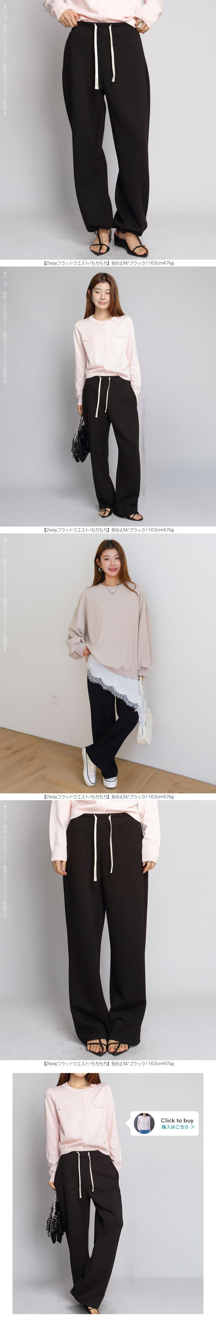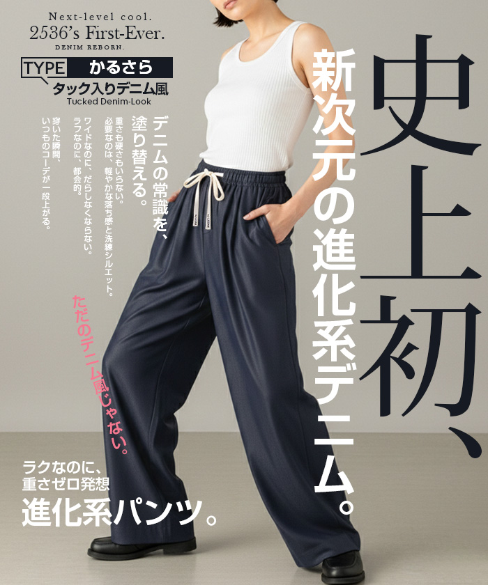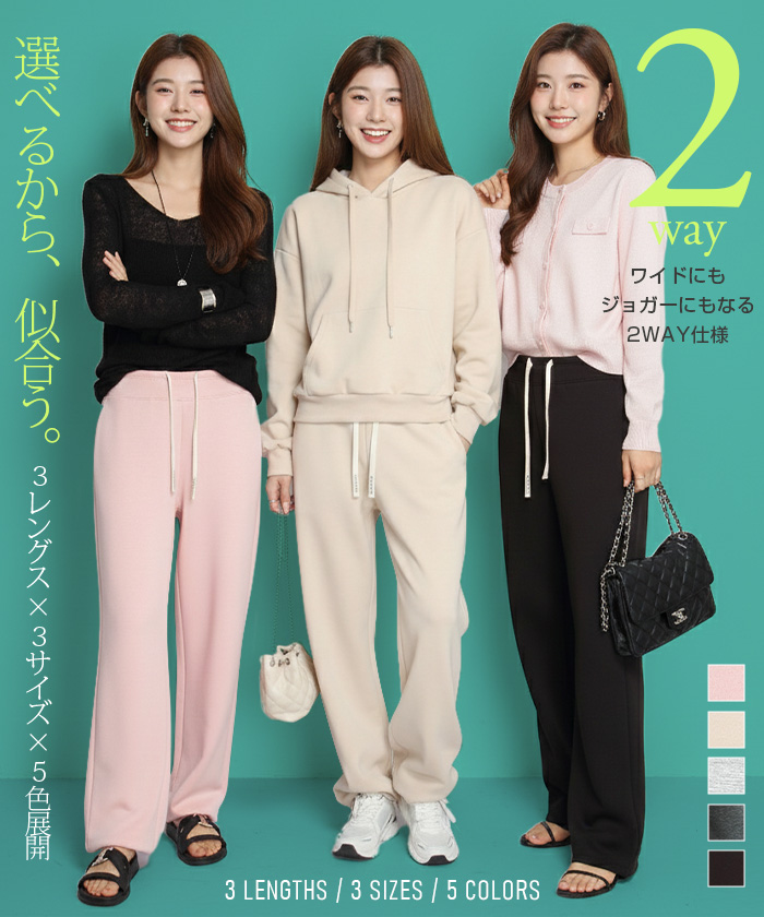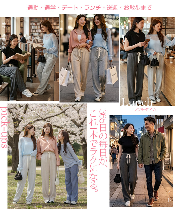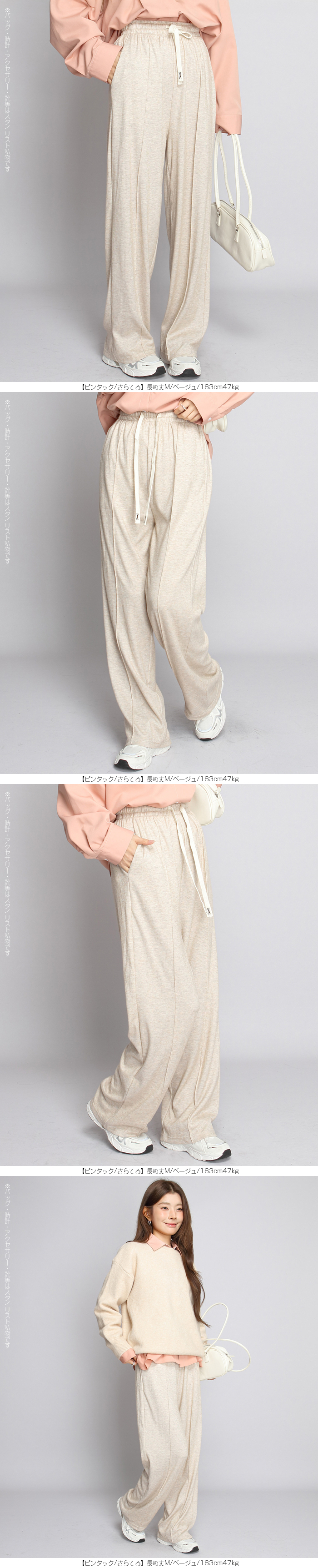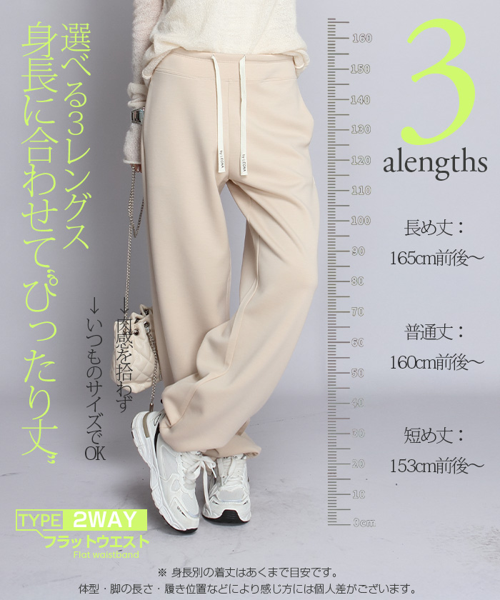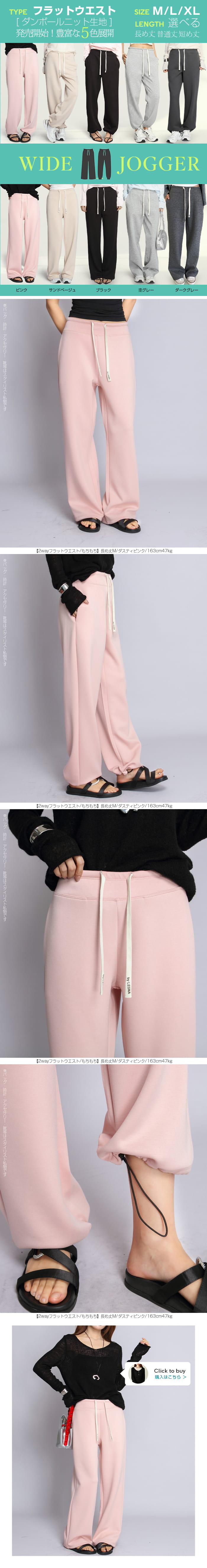 【 選べる丈&素材タイプイージーワイドパンツ 】 人気のイージーワイドパンツ。 もちもち素材の2way、フラットウエストですっきり穿けるタイプ、 もちもち素材にダブルウエストデザインのレイヤード風タイプ、 やわらかもちもちリブ素材、ピンタックデザインタイプ タック入りデニム風のかるさら素材など、選べるデザイン展開。 楽ちんなのにだらしなく見えず、ワンマイルウェアとしても活躍。 1枚持っておくと便利なデイリーアイテムです。 《商品ポイント》 ・2wayフラットウエスト / もちもち フラットウエストでスッキリした印象。 裾のドローコードでワイド→ジョガーの2wayシルエットが楽しめます。 ・ダブルウエスト / もちもち レイヤード風のダブルウエストデザインで、トレンド感のあるカジュアルスタイルに。 ・ピンタック / さらてろ センターピンタック入りで脚をまっすぐきれいに見せる美脚デザイン。 ・タック入りデニム風 / かるさら フロントタック入りで立体感のあるシルエット。 デニム風の見た目ながら軽くさらっとした着心地が魅力。 《デザイン》 ワイドストレートシルエットで脚のラインを拾いにくく、体型カバーにも◎。 柔らかく落ち感のある素材で、動くたびきれいなシルエットを演出します。 《コーディネート》 カジュアル:Tシャツやスウェット+スニーカーでデイリーに。 きれいめ:シャツやブラウスをタックインして大人コーデに。 スポーティ:キャップやナイロンジャケットでアクティブに。 ワンマイル:ラフだけどこなれ感のあるスタイルにも◎。 |