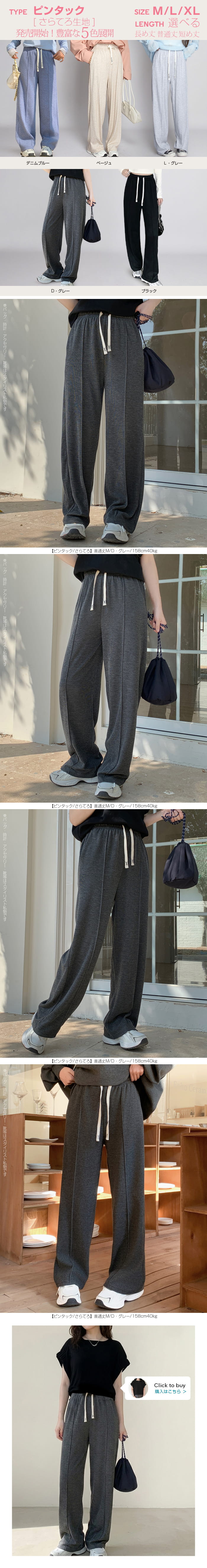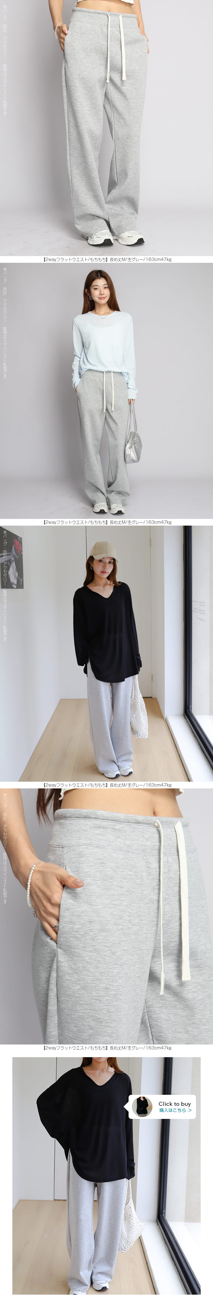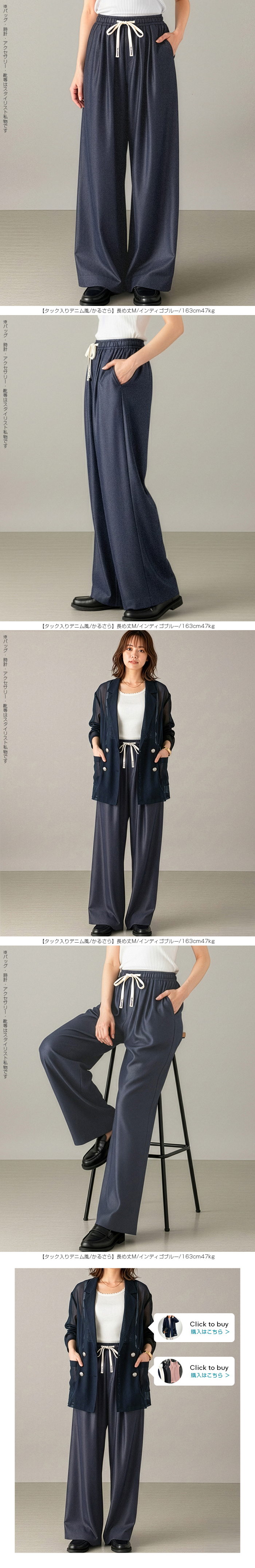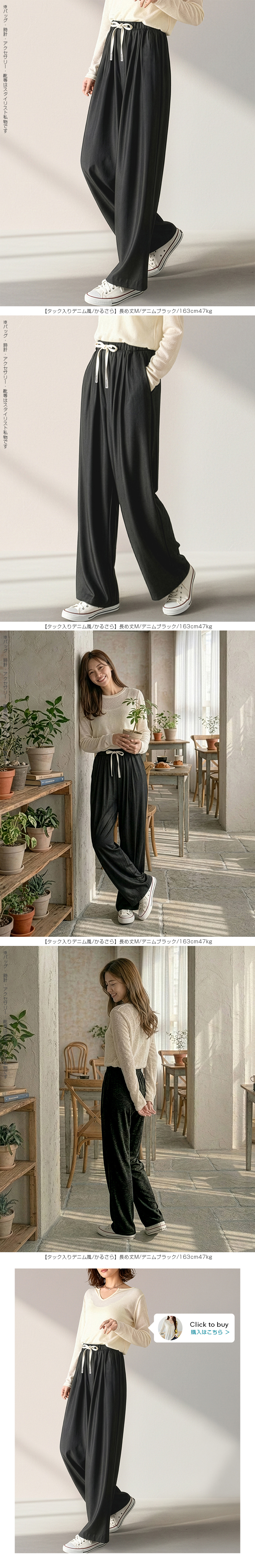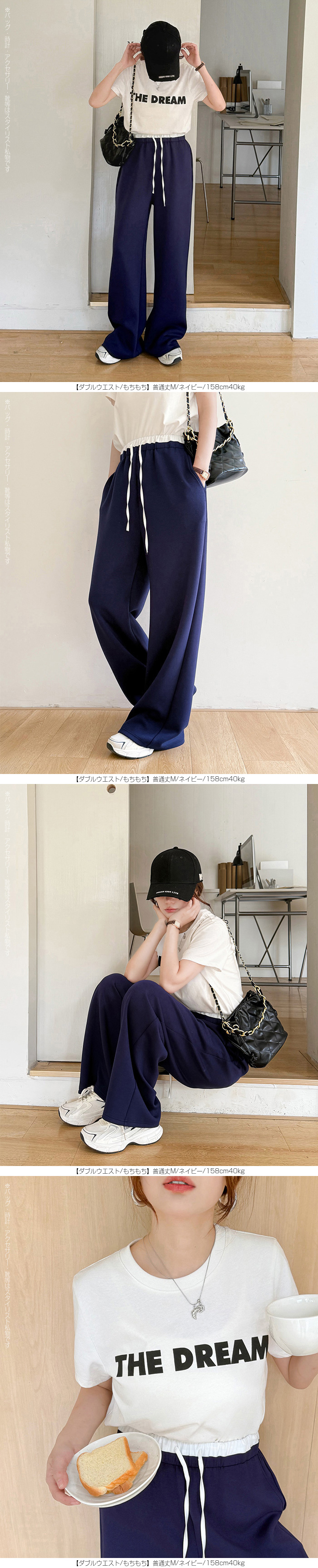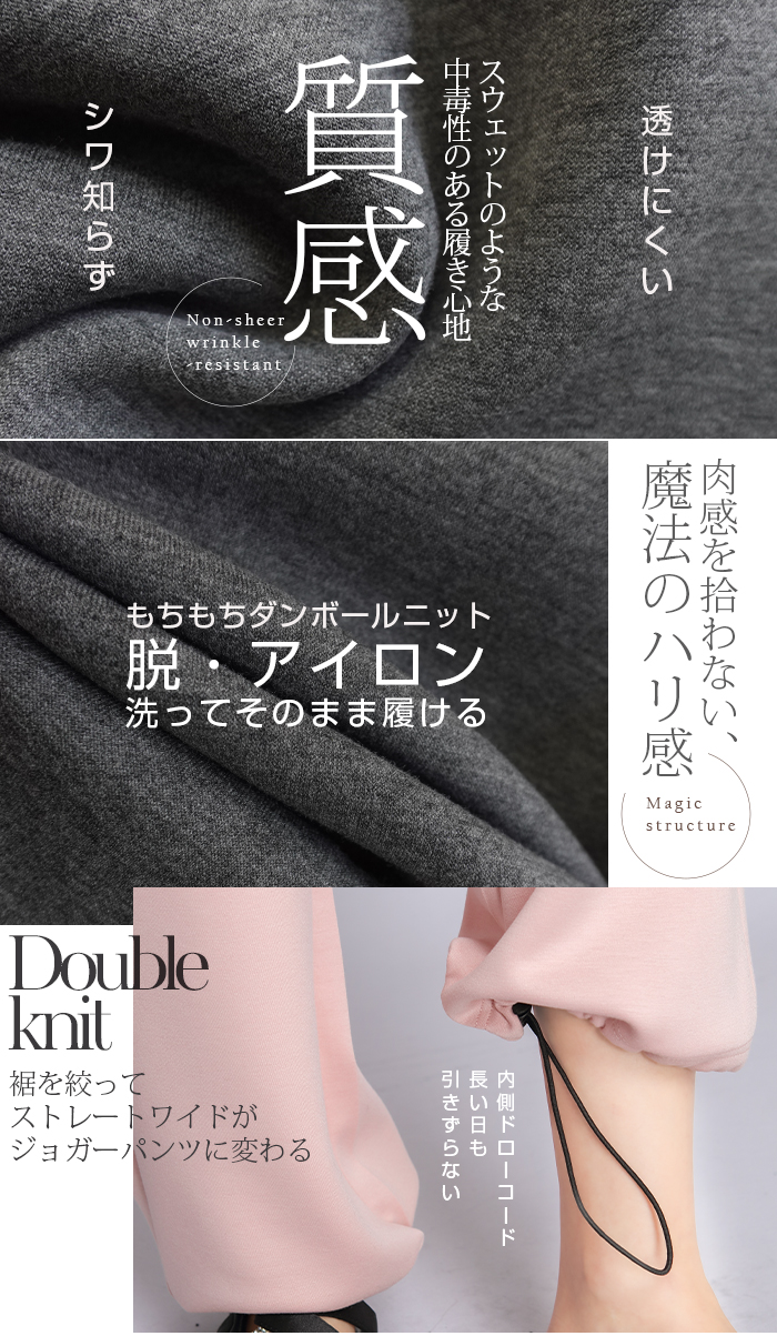 【 選べる丈&素材タイプイージーワイドパンツ 】 人気のイージーワイドパンツ。 もちもち素材の2way、フラットウエストですっきり穿けるタイプ、 もちもち素材にダブルウエストデザインのレイヤード風タイプ、 やわらかもちもちリブ素材、ピンタックデザインタイプ タック入りデニム風のかるさら素材など、選べるデザイン展開。 楽ちんなのにだらしなく見えず、ワンマイルウェアとしても活躍。 1枚持っておくと便利なデイリーアイテムです。 《商品ポイント》 ・2wayフラットウエスト / もちもち フラットウエストでスッキリした印象。 裾のドローコードでワイド→ジョガーの2wayシルエットが楽しめます。 ・ダブルウエスト / もちもち レイヤード風のダブルウエストデザインで、トレンド感のあるカジュアルスタイルに。 ・ピンタック / さらてろ センターピンタック入りで脚をまっすぐきれいに見せる美脚デザイン。 ・タック入りデニム風 / かるさら フロントタック入りで立体感のあるシルエット。 デニム風の見た目ながら軽くさらっとした着心地が魅力。 《デザイン》 ワイドストレートシルエットで脚のラインを拾いにくく、体型カバーにも◎。 柔らかく落ち感のある素材で、動くたびきれいなシルエットを演出します。 《コーディネート》 カジュアル:Tシャツやスウェット+スニーカーでデイリーに。 きれいめ:シャツやブラウスをタックインして大人コーデに。 スポーティ:キャップやナイロンジャケットでアクティブに。 ワンマイル:ラフだけどこなれ感のあるスタイルにも◎。 |