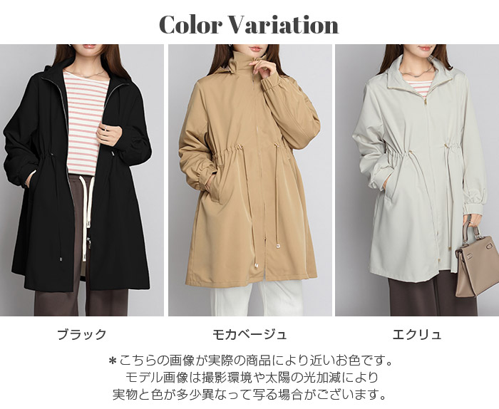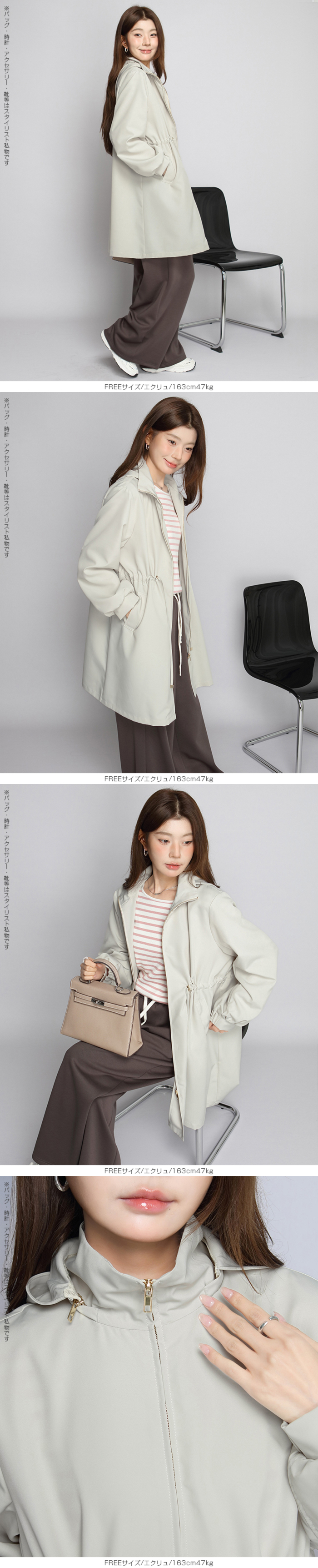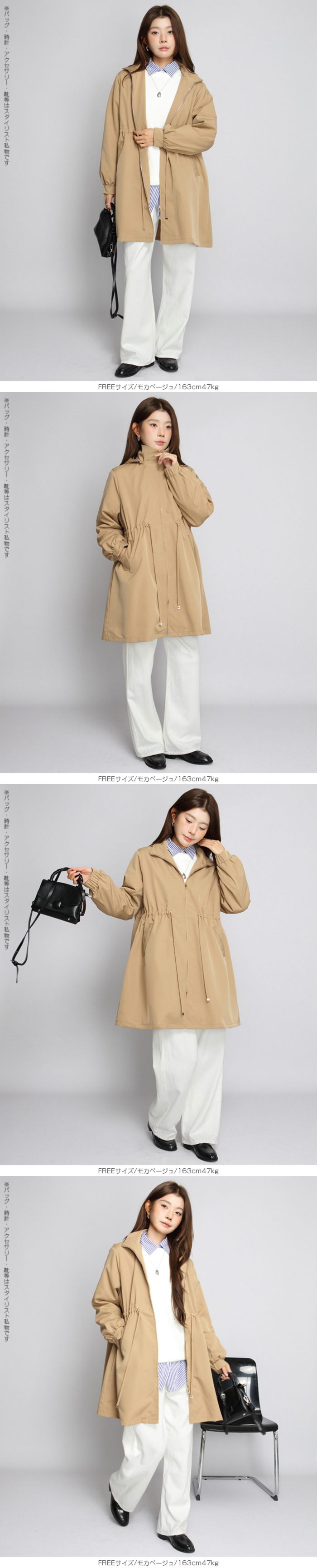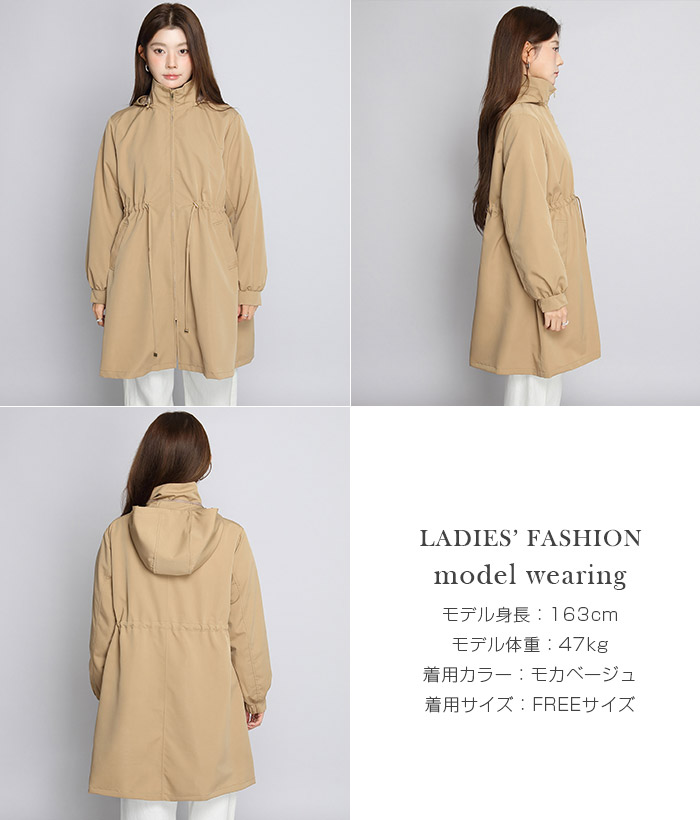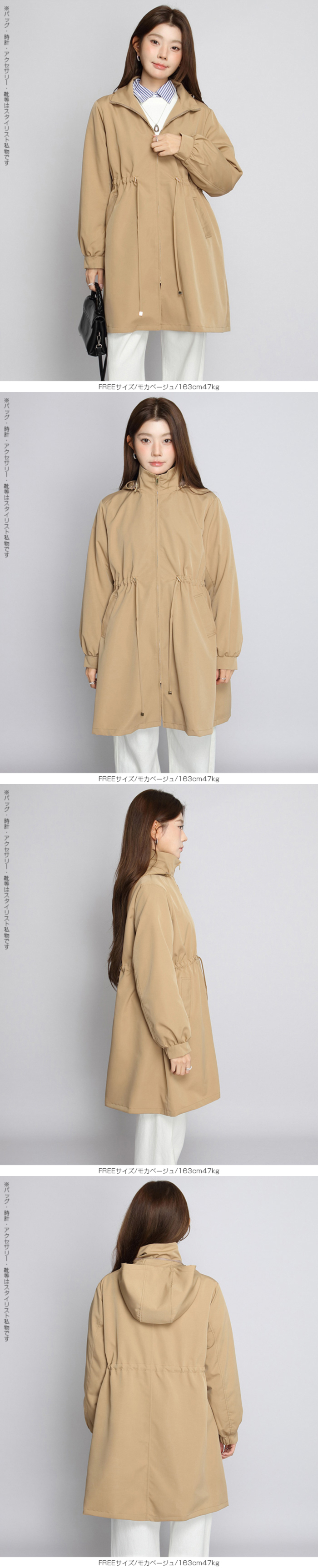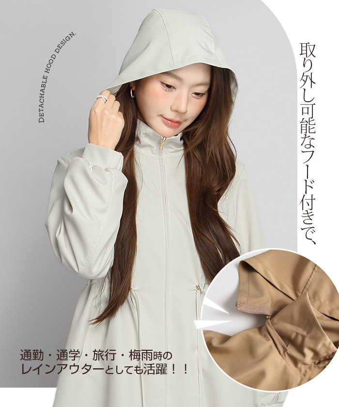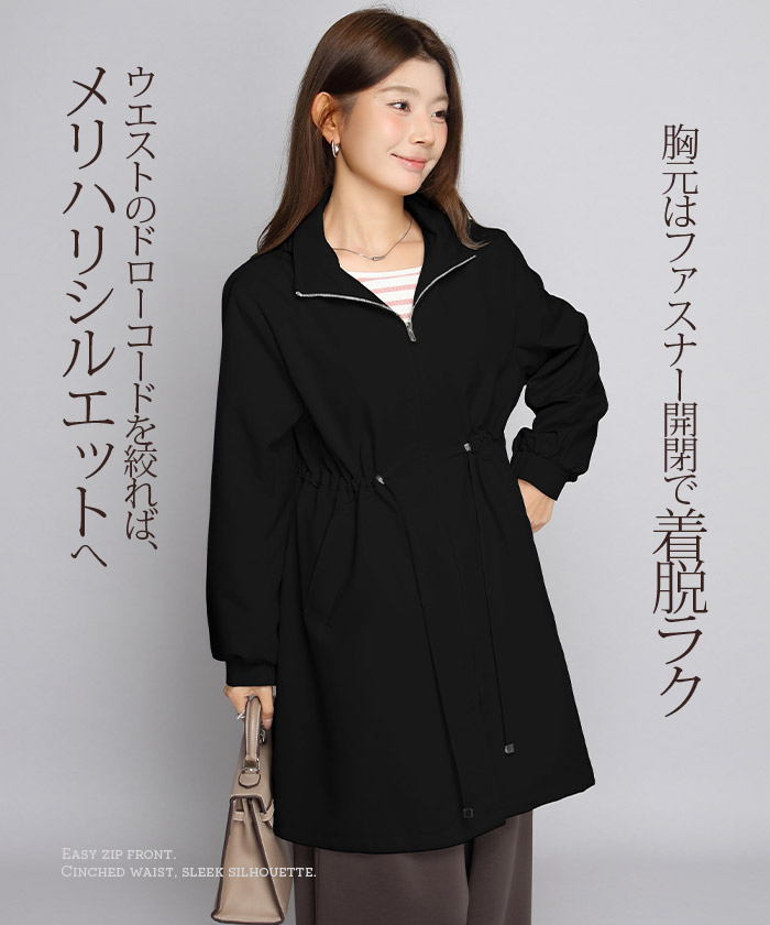 きれいめにもカジュアルにも馴染む、 撥水スタンドカラーロングコート。 軽量でしなやかな生地が雨粒をはじき、 防風性も確保。 前はファスナー開閉で着脱ラク、 ウエストのドローコードを絞ればメリハリシルエットへ。 ヒップまでしっかり隠れるロング丈で体型カバー効果も抜群。 取り外し可能なフード付きで、 通勤・通学・旅行・梅雨時のレインアウターとしても活躍。 両サイドポケット付きで実用性も◎。 春・秋のライトアウター、 マウンテンパーカーやモッズコートの きれいめ代替としておすすめです。 《商品ポイント》 撥水・防風の軽量素材で急な雨風にも対応 スタンドカラーが首元をカバーし小顔見え ウエストドローコードでサイズ調節&スタイルアップ 体型を拾いにくいロング丈でヒップまでしっかりカバー 収納フード/両サイドポケット付きでデイリーに便利 《デザイン・シルエット》 すっきり見えするIライン×絞れるウエストで「隠すよりメリハリ」 ゆとりのある袖と身幅でニットやスウェットの上からも楽ちんレイヤード ミニマルな比翼風ファスナーで上品な印象 《コーディネート提案》 きれいめ:テーパードパンツ+パンプスで通勤コーデ カジュアル:デニム×スニーカーで大人のマンパ風に 雨の日:撥水ボトムやレインブーツと合わせて梅雨の通学・お出かけに◎ 《サイズ・カラーバリエーション》 サイズ:FREE カラー:エクリュ/ブラック/モカベージュ 《素材・機能性》 ・素材:ポリエステル100% ・透け感:なし ・伸縮性:なし ・厚み:普通 |