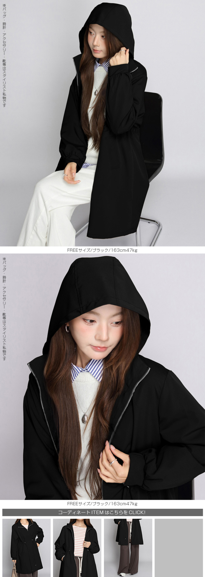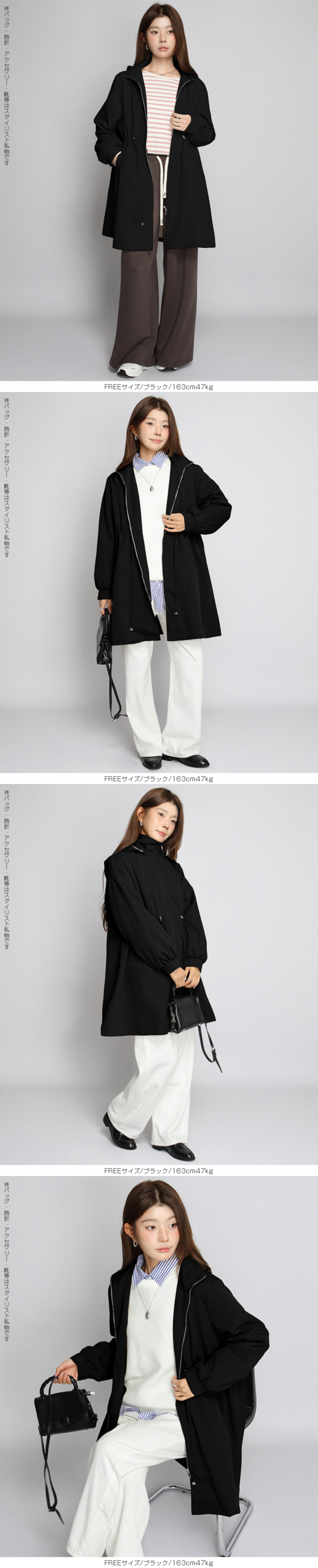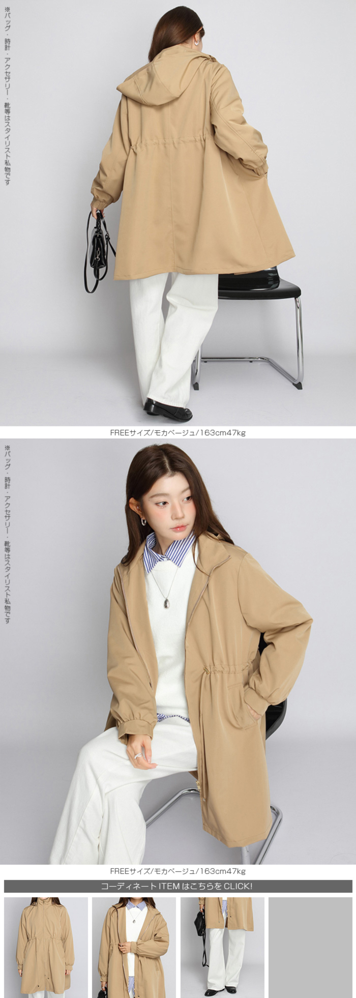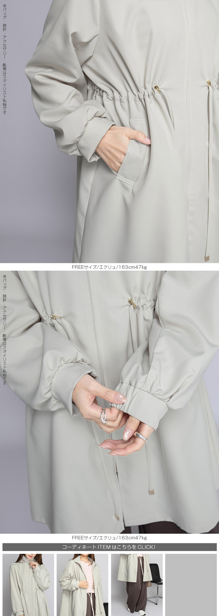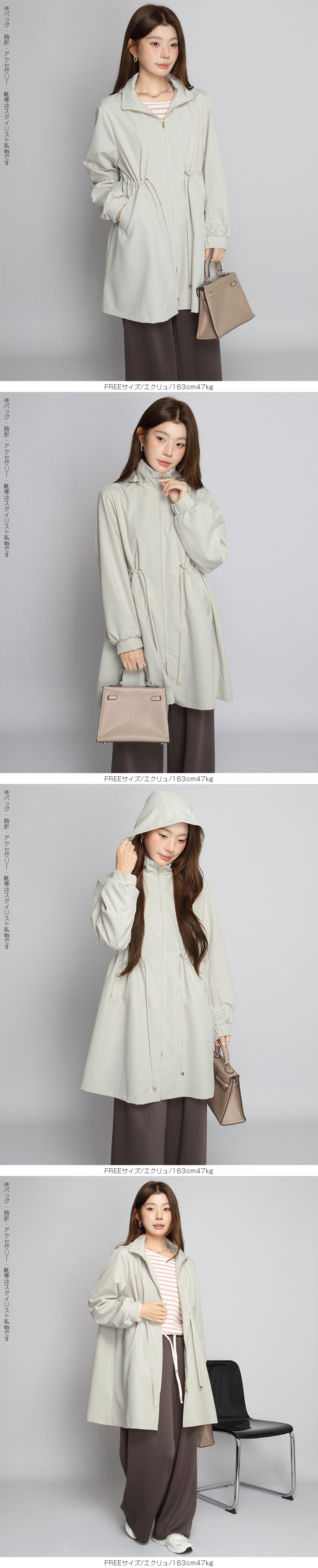 きれいめにもカジュアルにも馴染む、 撥水スタンドカラーロングコート。 軽量でしなやかな生地が雨粒をはじき、 防風性も確保。 前はファスナー開閉で着脱ラク、 ウエストのドローコードを絞ればメリハリシルエットへ。 ヒップまでしっかり隠れるロング丈で体型カバー効果も抜群。 取り外し可能なフード付きで、 通勤・通学・旅行・梅雨時のレインアウターとしても活躍。 両サイドポケット付きで実用性も◎。 春・秋のライトアウター、 マウンテンパーカーやモッズコートの きれいめ代替としておすすめです。 《商品ポイント》 撥水・防風の軽量素材で急な雨風にも対応 スタンドカラーが首元をカバーし小顔見え ウエストドローコードでサイズ調節&スタイルアップ 体型を拾いにくいロング丈でヒップまでしっかりカバー 収納フード/両サイドポケット付きでデイリーに便利 《デザイン・シルエット》 すっきり見えするIライン×絞れるウエストで「隠すよりメリハリ」 ゆとりのある袖と身幅でニットやスウェットの上からも楽ちんレイヤード ミニマルな比翼風ファスナーで上品な印象 《コーディネート提案》 きれいめ:テーパードパンツ+パンプスで通勤コーデ カジュアル:デニム×スニーカーで大人のマンパ風に 雨の日:撥水ボトムやレインブーツと合わせて梅雨の通学・お出かけに◎ 《サイズ・カラーバリエーション》 サイズ:FREE カラー:エクリュ/ブラック/モカベージュ 《素材・機能性》 ・素材:ポリエステル100% ・透け感:なし ・伸縮性:なし ・厚み:普通 |