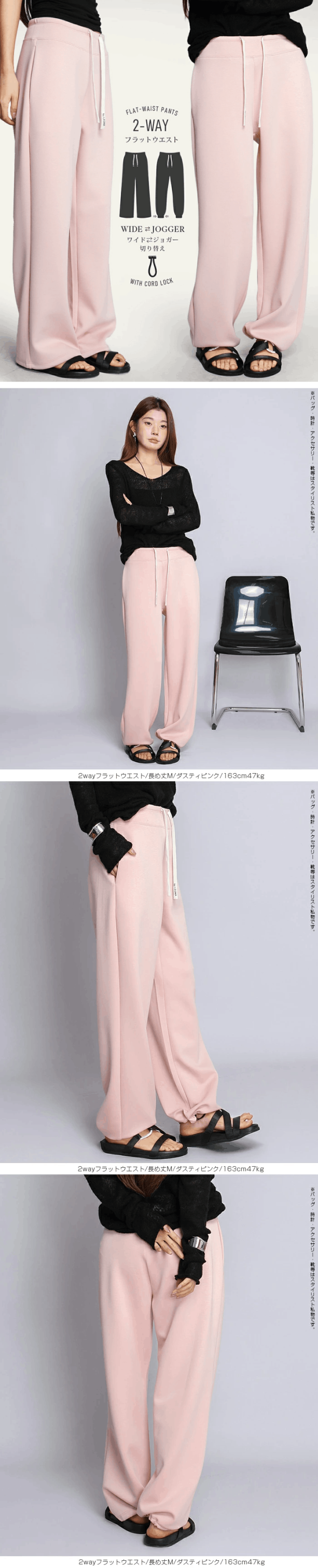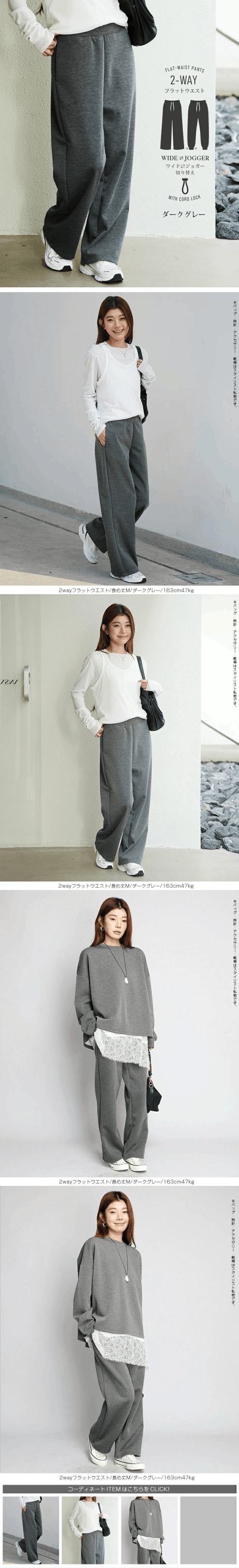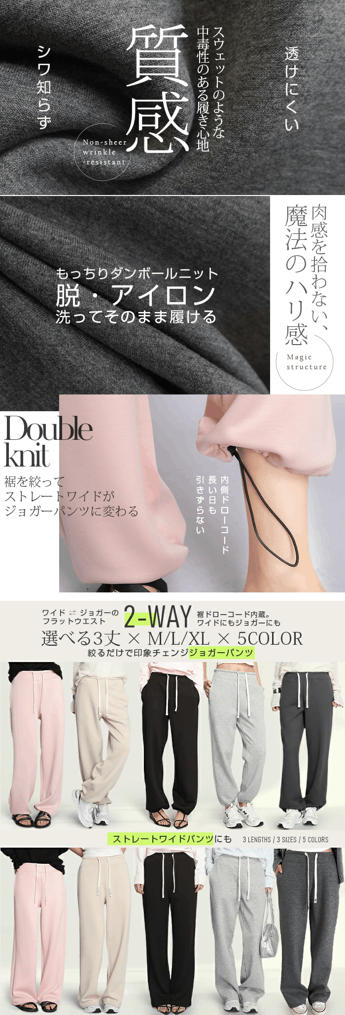 年間ランキング上位の裏起毛タイプと同シルエット。 春秋にちょうどいいダンボールニット素材の2WAYパンツです。 裾の内側ドローコードを絞るだけで、 ストレートワイドからジョガーパンツへ簡単チェンジ。 さらに短め丈・普通丈・長め丈の3丈展開で、 身長や好みに合わせてベストバランスを選べます。 スウェット感のある柔らかな穿き心地なのに、 きれい見えする表面感でオフィスカジュアルにも対応。 「楽なのにちゃんとして見える」 大人のための万能イージーパンツです。 【素材感・着心地】 ・スウェットライクなダンボールニット ・程よいハリで体のラインを拾いにくい ・ストレッチ性があり動きやすい ・ロングシーズン対応素材(春・秋・初冬) 裏起毛タイプより軽やかで、長時間でも快適。 【シルエット・サイズ感】 ・ヒップ〜太ももに程よいゆとり ・縦ラインが出るストレート設計 ・裾ドローコード内蔵(外から見えない仕様) ・ワイド ? ジョガーの2WAY サイズ:M / L / XL 丈:短め / 普通 / 長め 「丈が長い問題」も絞って解決できます。 |