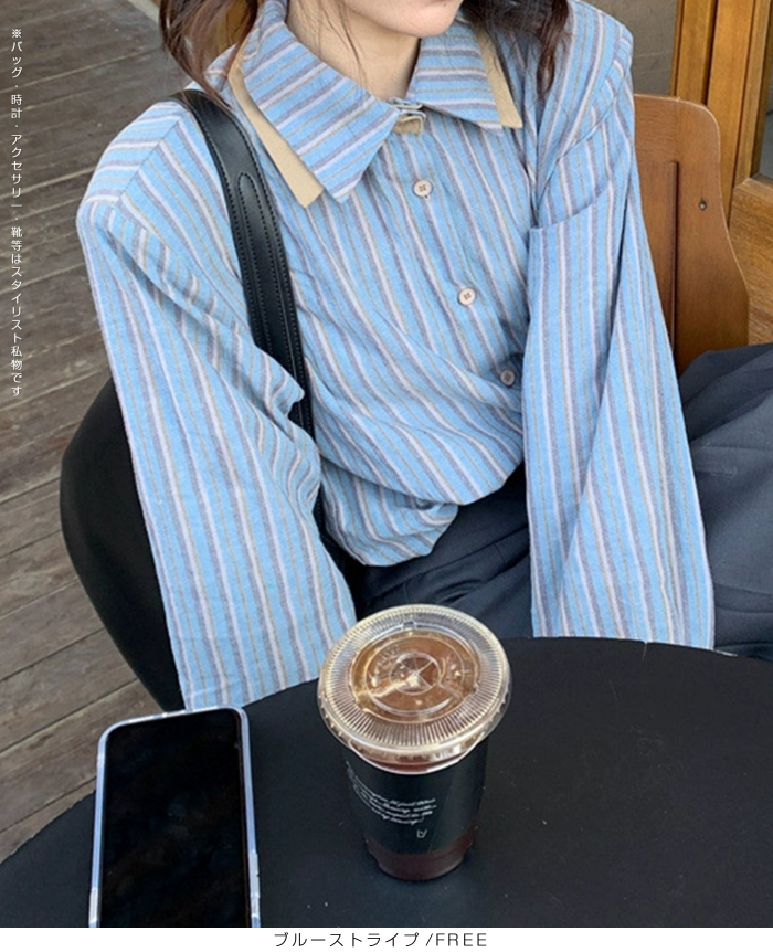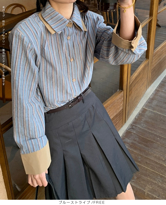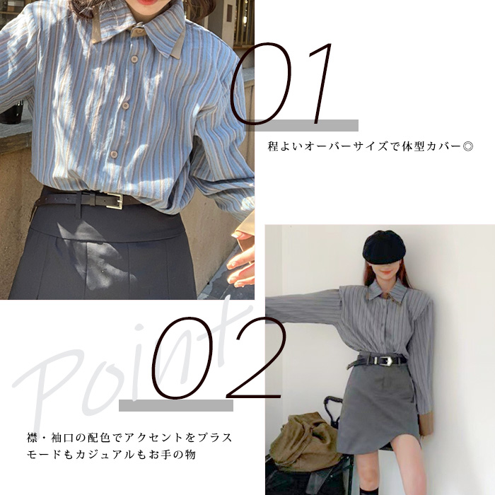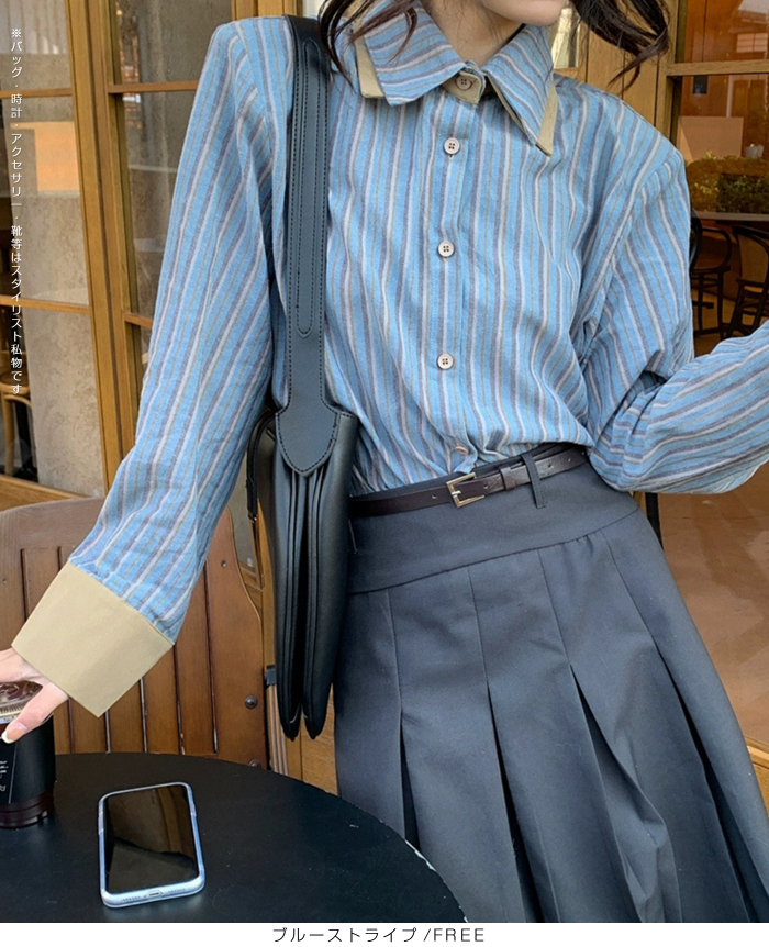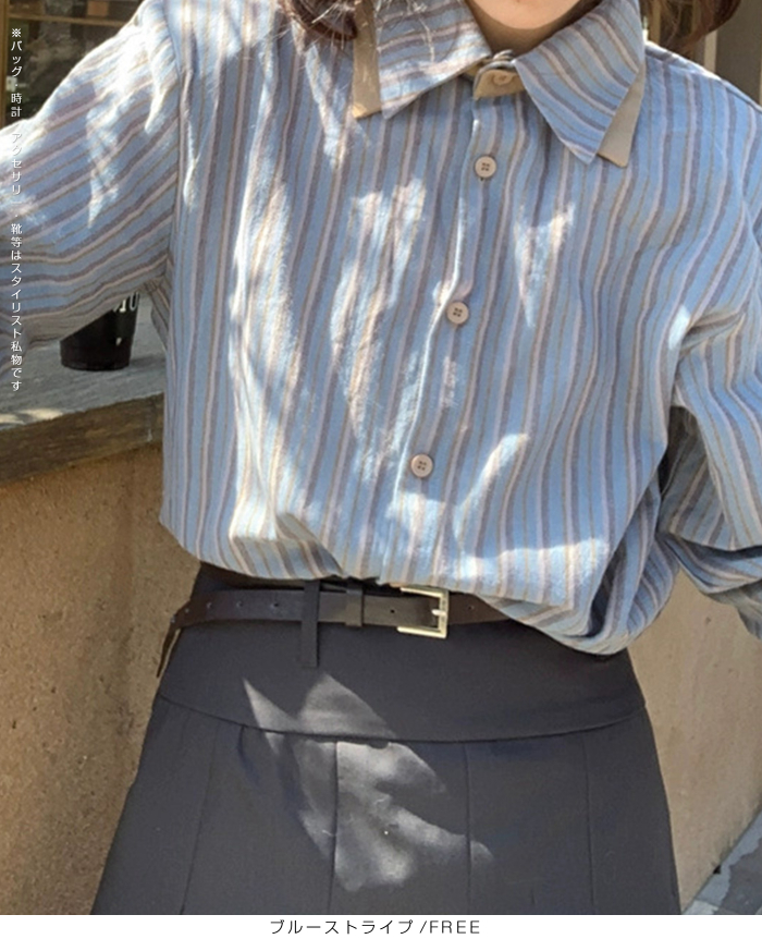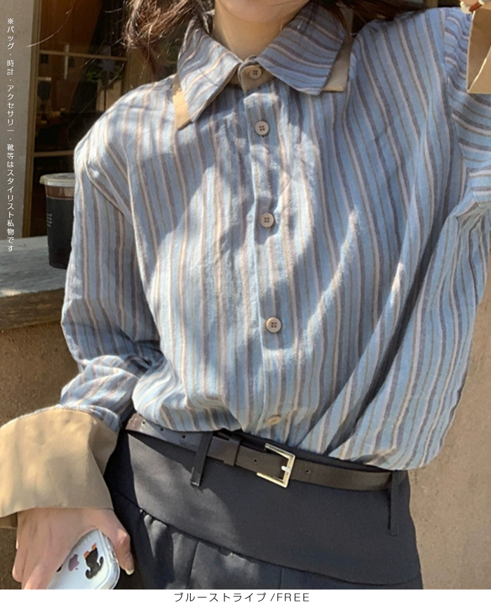 バイカラーストライプシャツ レディースシャツ 長袖シャツ きれいめシャツ シンプルシャツ おしゃれシャツ スタイリッシュシャツ フェミニンシャツ ナチュラルコーデシャツ 体型カバーシャツ 通勤シャツ 通学シャツ