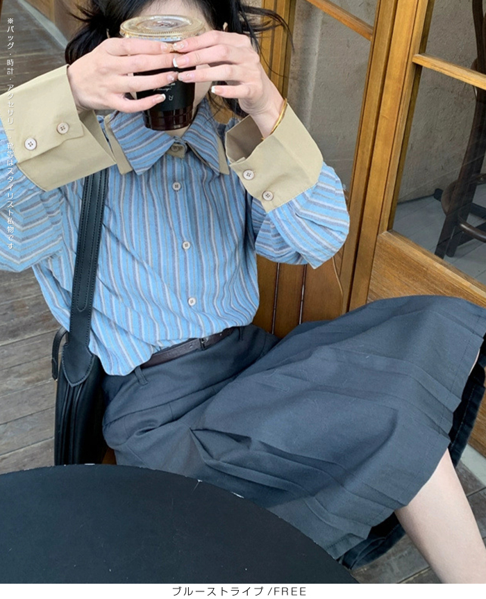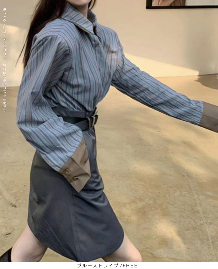 シャツ トップス Yシャツ レディース 春 秋 ストライプ プリント バイカラー 配色デザイン オーバーサイズ ドロップショルダー モード ブルーストライプ