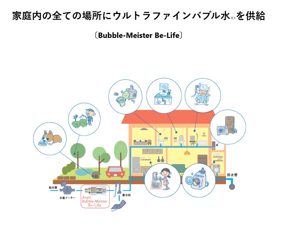 | Be-Life ウルトラファインバブル発生器 ・毛穴よりも小さなサイズの泡(ウルトラファインバブル)を発生させ、家庭内の全ての場所にウルトラファインバブル水を供給。 ・本体寸法(約):5.5 × 11.5(cm) ・重量(約):670g ・本体材質:ステンレス ・取扱説明書:紙 ・メーカー希望小売価格:350,000円(税込385,000円) 適応環境 ・一戸建て住宅 ・浴室・台所・洗濯機・トイレなど、家庭内すべての水回り |