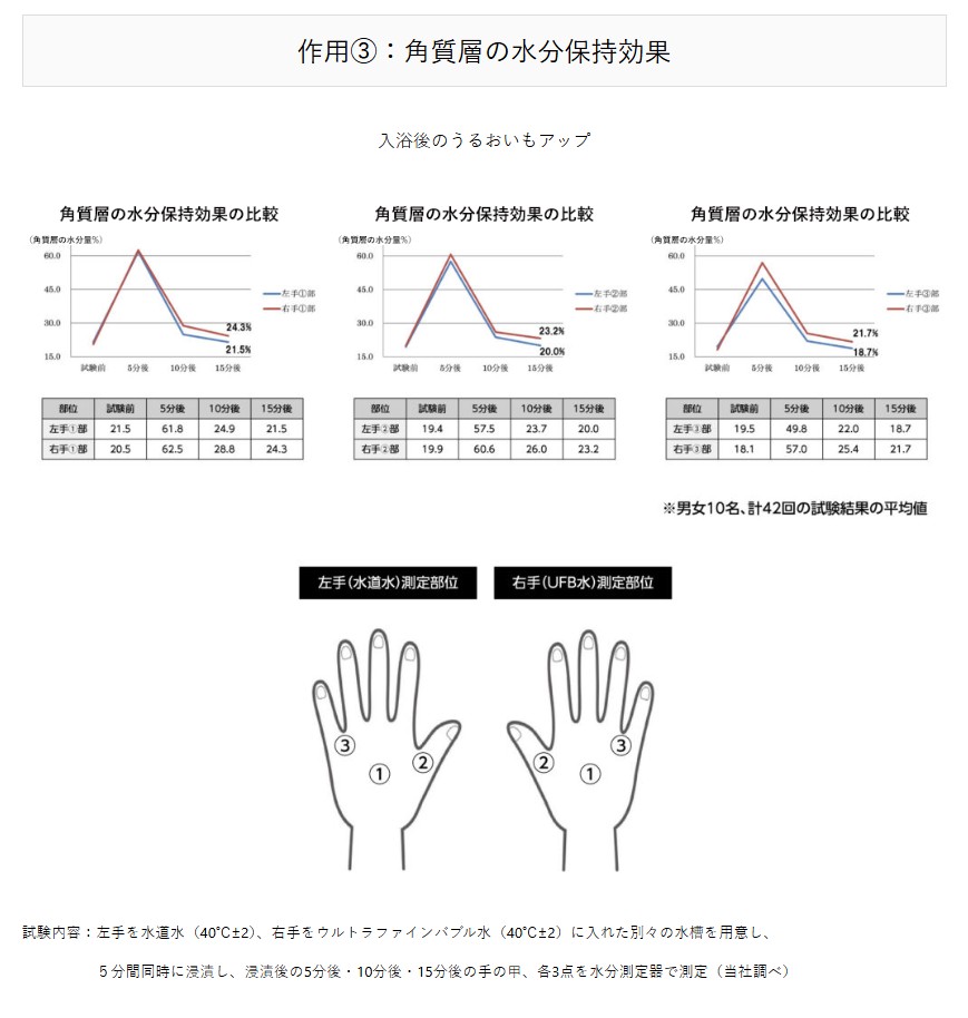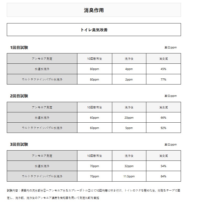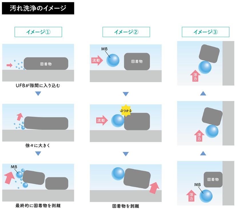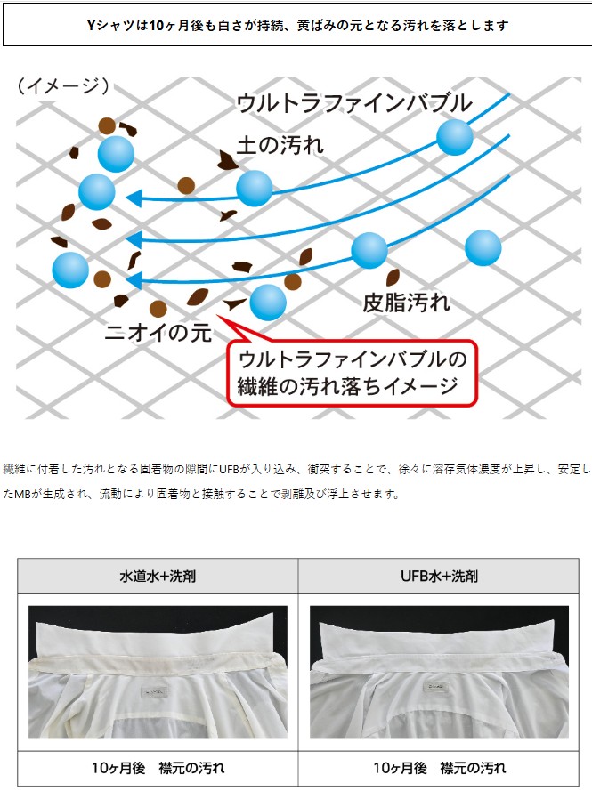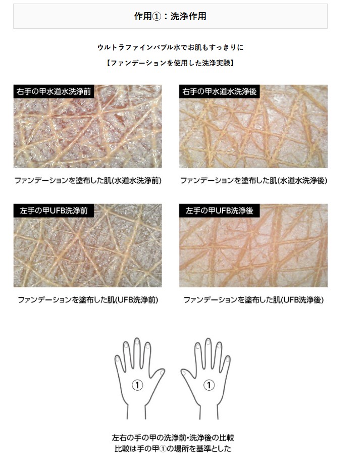 | 1.洗浄力の向上: ・ファンデーションや皮脂汚れを効果的に除去。 ・排水管やフライパンの頑固な油汚れも短時間で清潔に。 2.保湿・温度保持: ・肌表面の温度を保ち、乾燥を防ぐ。 ・入浴後の肌の潤いを長時間キープ。 3.消臭・防臭効果: ・トイレや洗濯機内部の臭いを軽減。 ・臭気成分を効率よく除去し、快適な空間を実現。 4.衣類の白さをキープ: ウルトラファインバブル水で洗濯することで、黄ばみの原因を落とし、衣類を長く白く保つ。 |