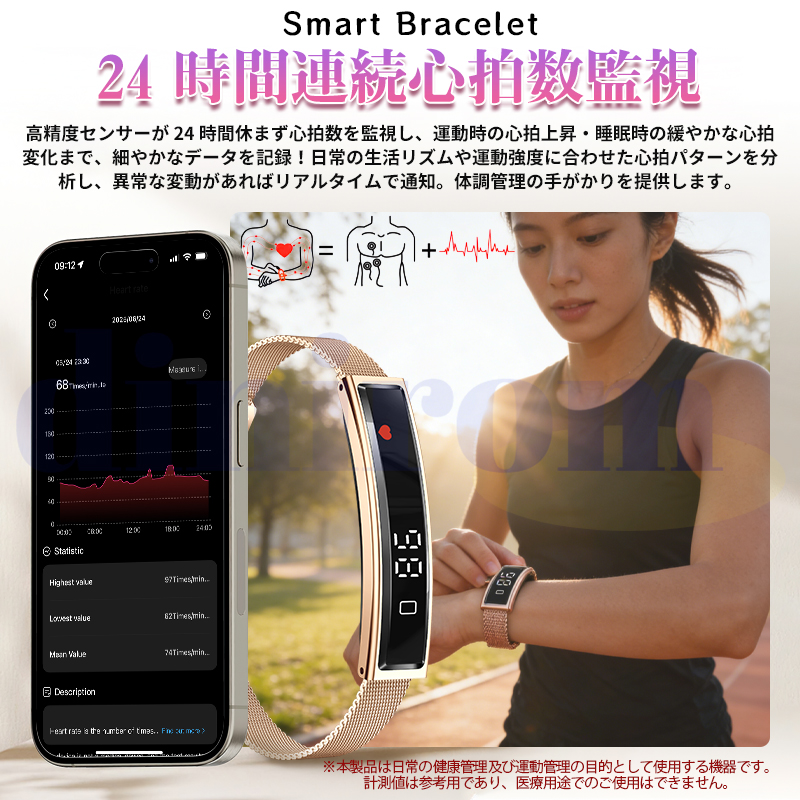 本製品は日常の健康管理および運動管理を目的とした機器です。計測値は参考用であり、医療診断や治療目的では使用できません。