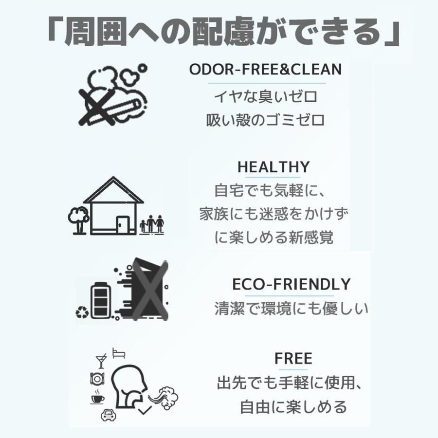 初めてでも簡単 カートリッジをはめるだけ1.待ち時間0 吸うだけで起動します2.使い切ったカートリッジはゴミ箱へ3.バッテリーは大容量 1回あたりの吸引回数や時間などの制限はなし 充電しながらも使えます。