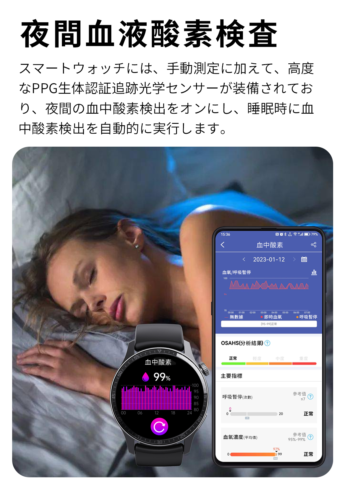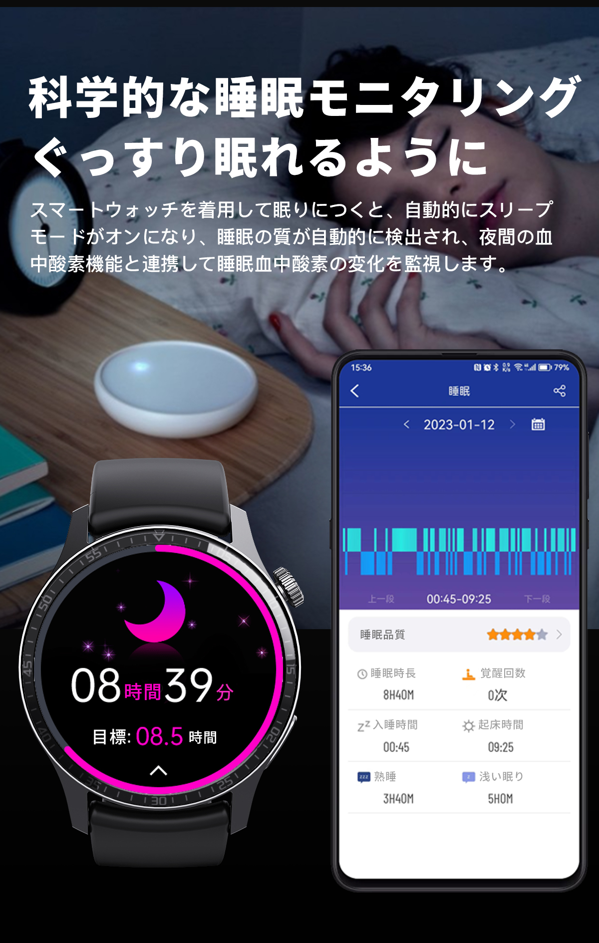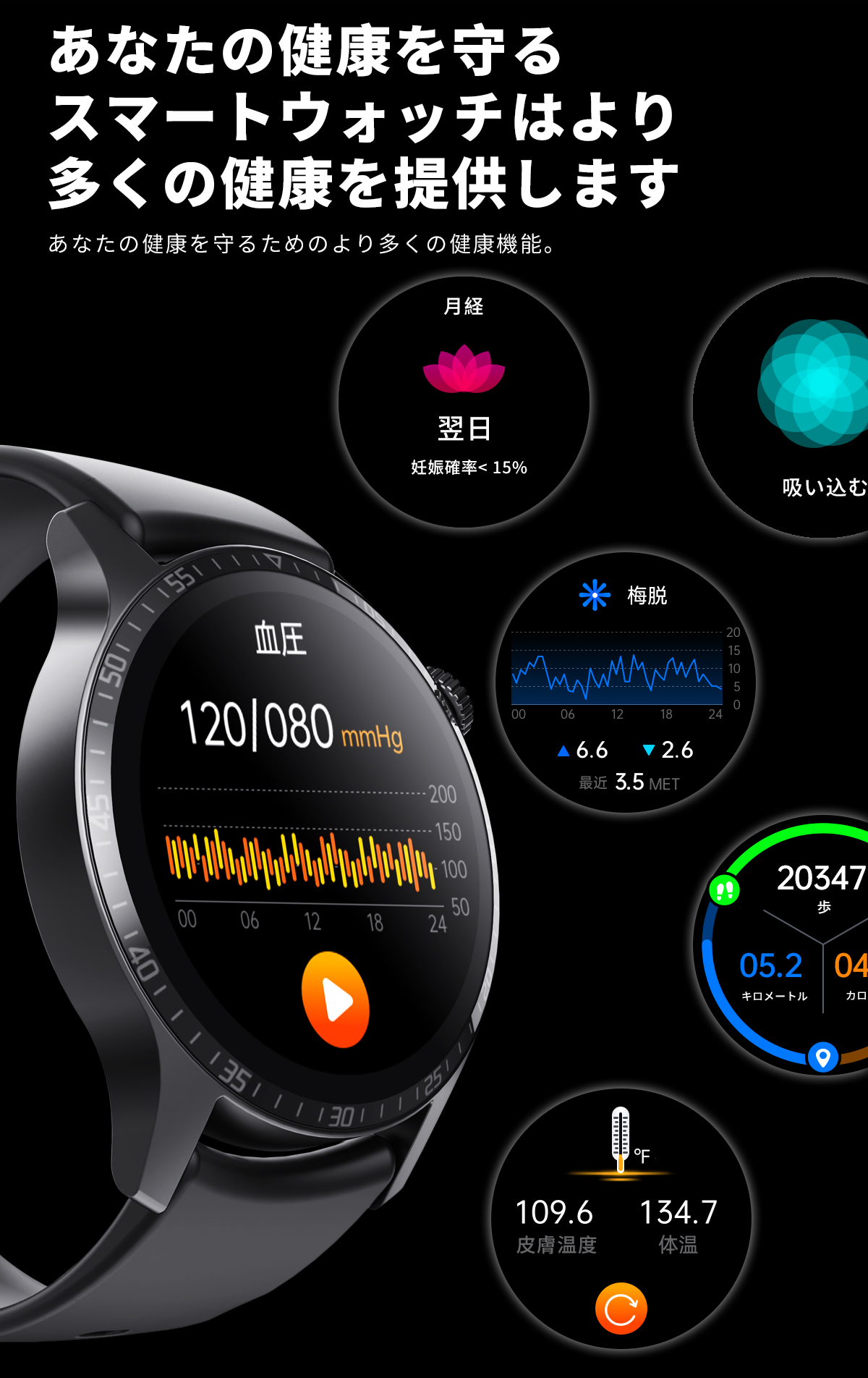 呼吸トレーニング機能も搭載され、深呼吸訓練を通し、長居注意、ストレスを解放し、リラックスできます。歩数、カロリー消費を記録する上、睡眠質(深い睡眠、浅い睡眠、レム睡眠)を確認することもできます。ストップウォッチ、天気予報、音楽制御、女性の月経周期の記録、文字盤自由?更、携帯探しなど様々な機能を搭載されております。