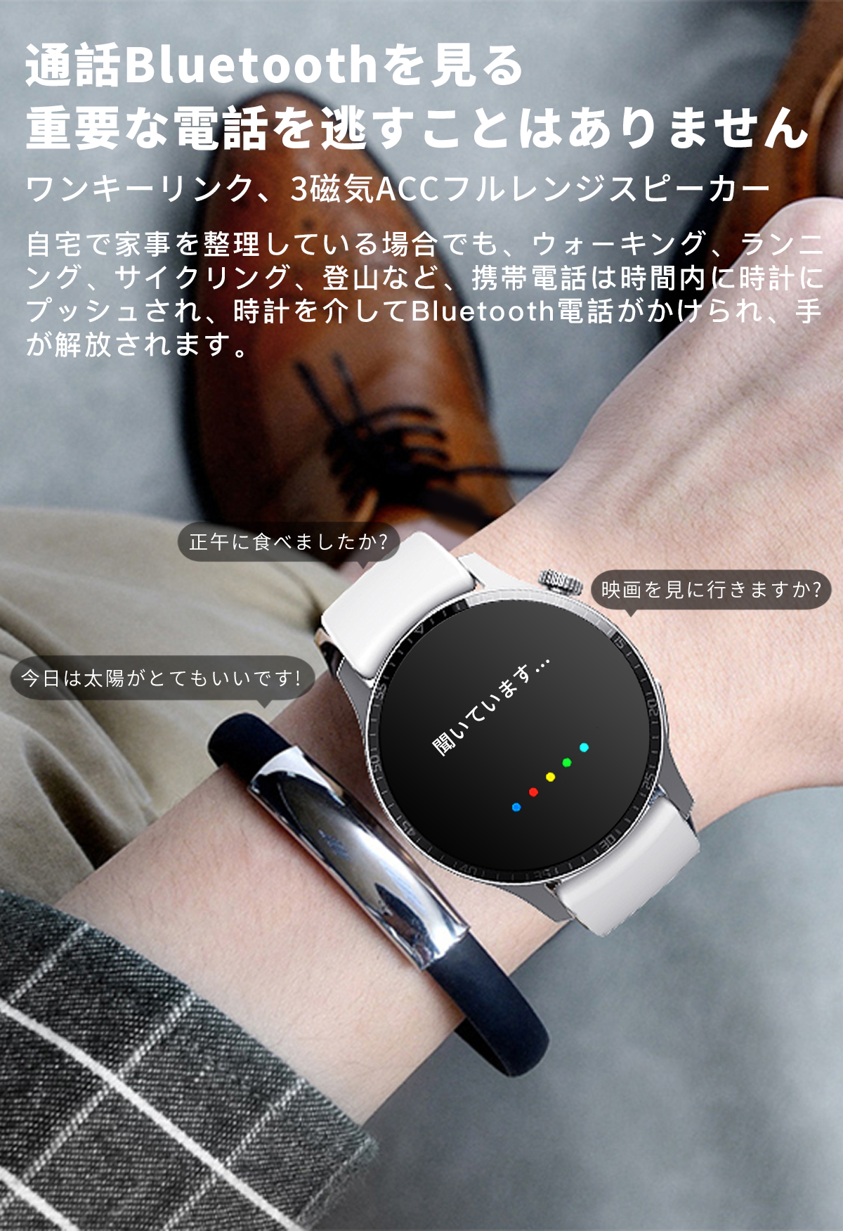 革新技術によって低消費&エネルギーチップとBluetooth 5.2通話機能を搭載し、ウォッチを使って電話に出たり、直接電話をかけたりできます。運転、家事、運動中で両手を解放し、より便利に〜また、音声アシスタント対応可能で、スマホを出さなくても、スマートウォッチの 音声アシスタント画面でSiriを呼び出し、すごく便利。着信履歴のチェック、連絡先登録、ダイヤルパッド付き、運転中、運動中などスマホをすぐに取り出せない状況でも大事な着信を逃しません。また専用アプリに連絡先を追加すると、ウォッチで追加したリストを表示され、リストから電話もかけます。