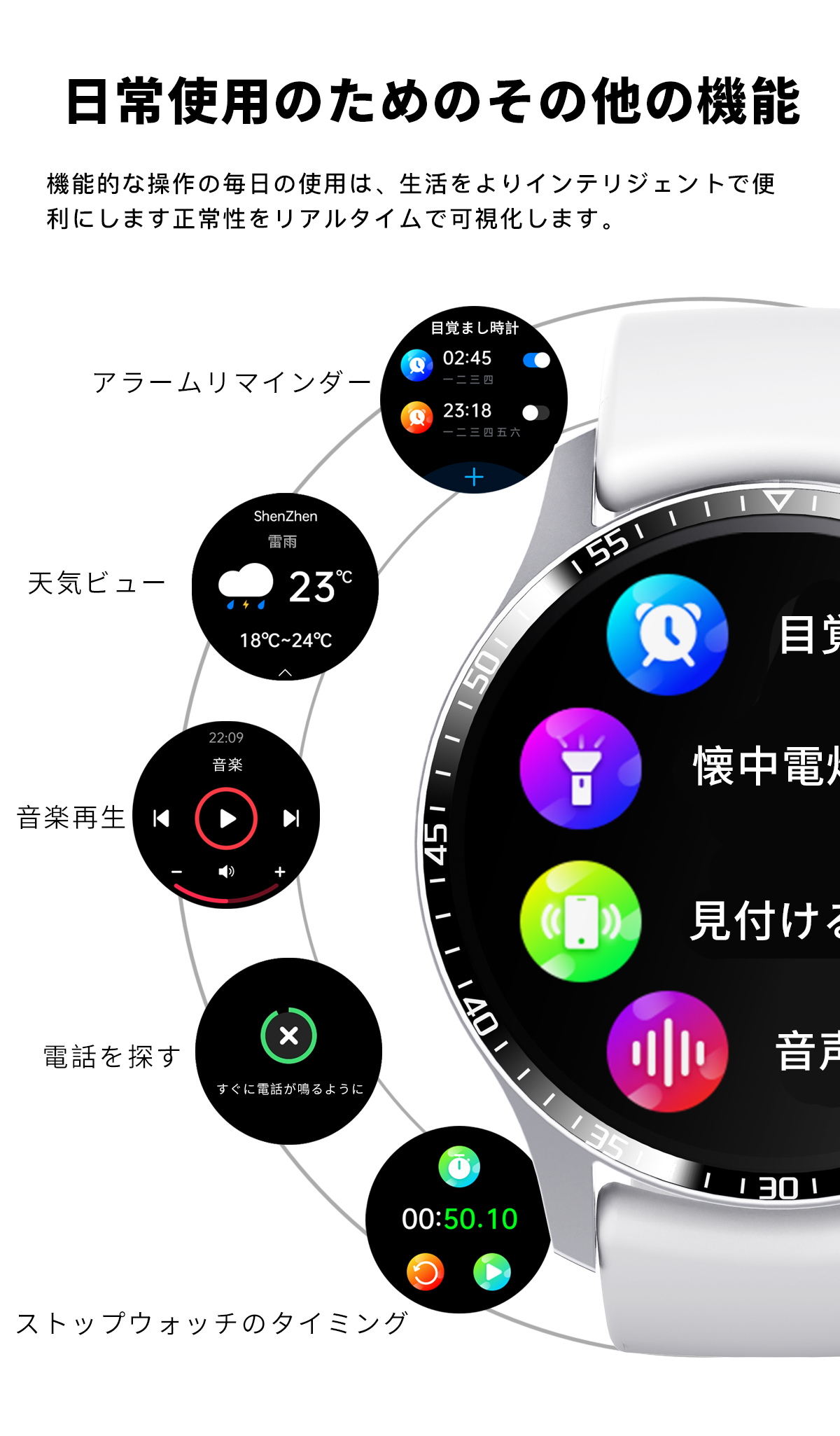 ●他にもAI音声アシスタント、目覚まし時計、天気予報、音楽制御、ステップアップ、遠隔カメラ、スマホを探す、座りがち注意などの多機能が搭載され、毎日の生活習慣の改善や日常健康管理に役立ちます