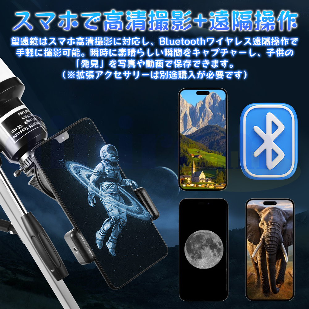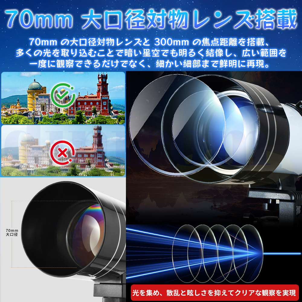 大口径: 70mm 口径と 300mm 焦点距離により、より多くの光とより鮮明な画像が得られ、初心者でも鮮明な画像を得ることができます。口径が大きいほど、視野が広くなり、画像が鮮明になります。