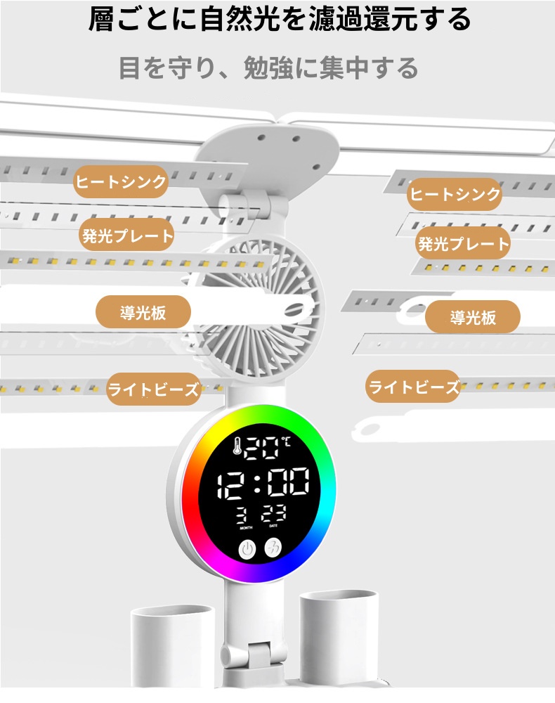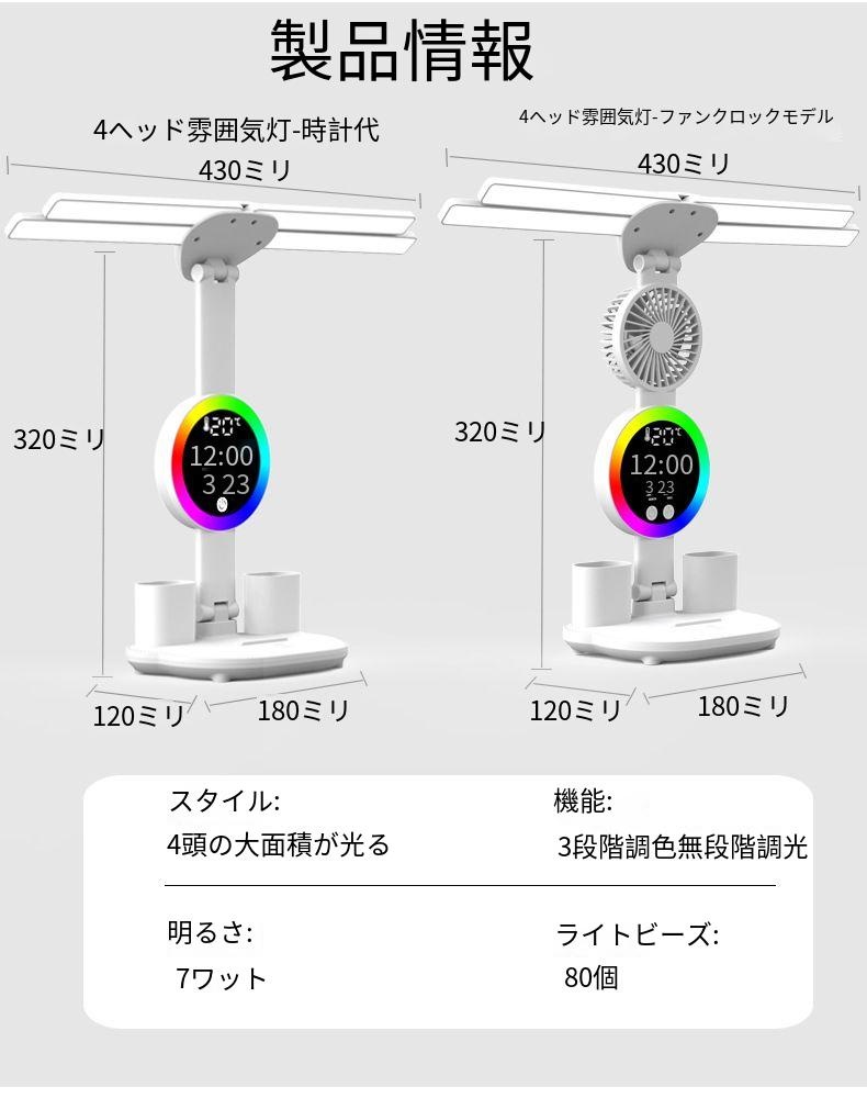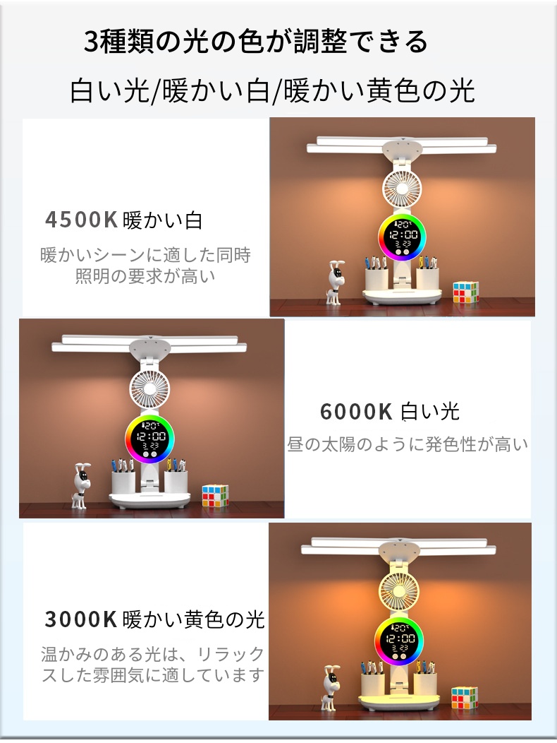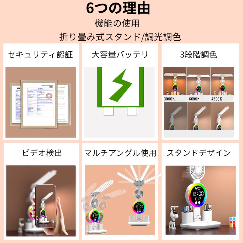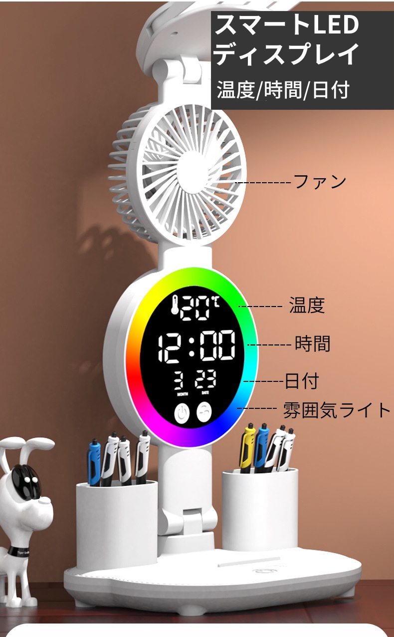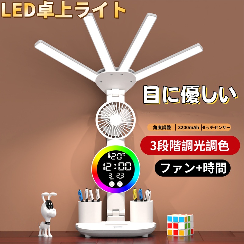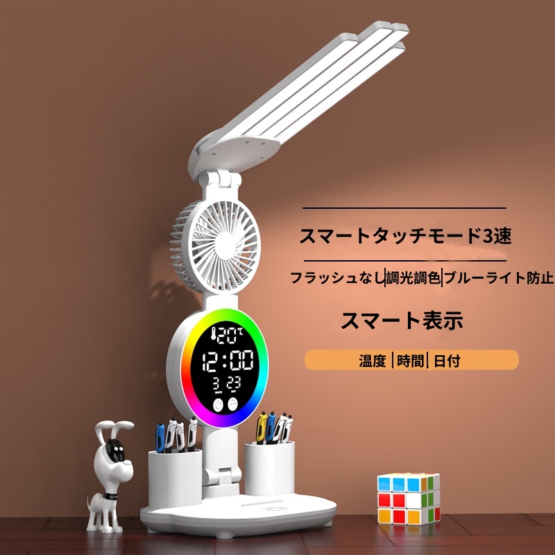 テーブルランプ デスクトップランプ LED目の保護ランプ 折りたたみ式 明るさ調整可能 充電式 コンパクト 常夜灯 ムードランプ 時計 扇風機 デスクライト 読書灯