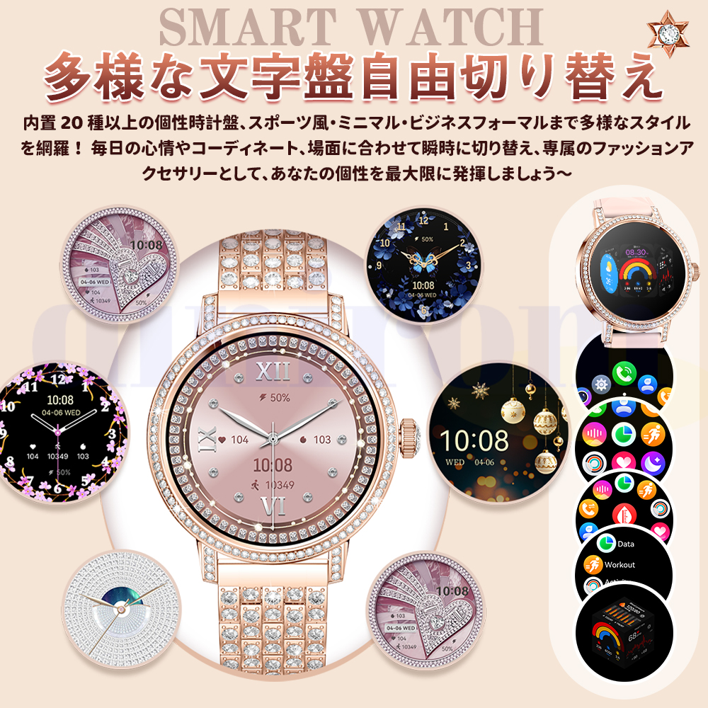 女性周期、カメラ、音楽制御、アラーム、着信通知、天気予報など日常生活に実用な機能満載!24時間健康管理、血圧、血中酸素、心拍数などご自分に関わる機能搭載されており、常に気を配り、状況を詳しく把握することができます。また睡眠時間や睡眠の質を正確に計測できる、意識的にスケジュールや習慣などを改善します。