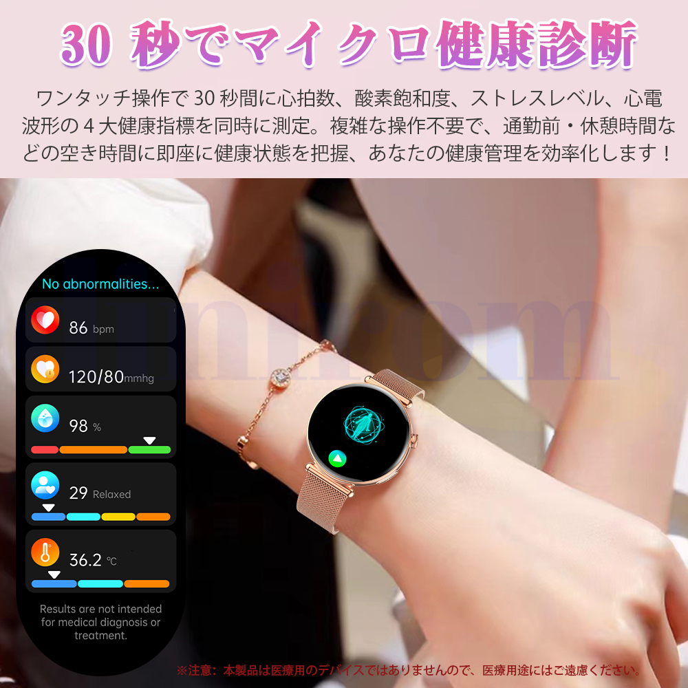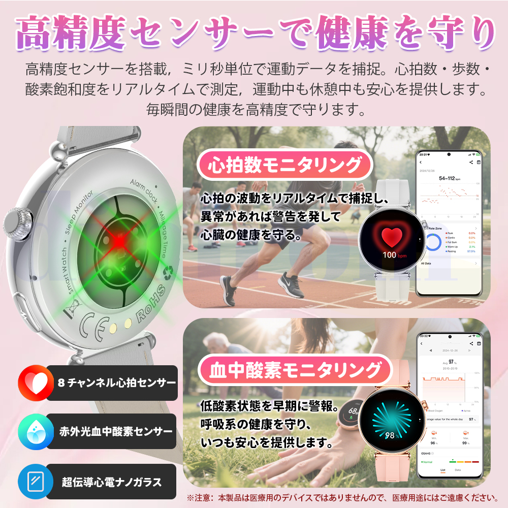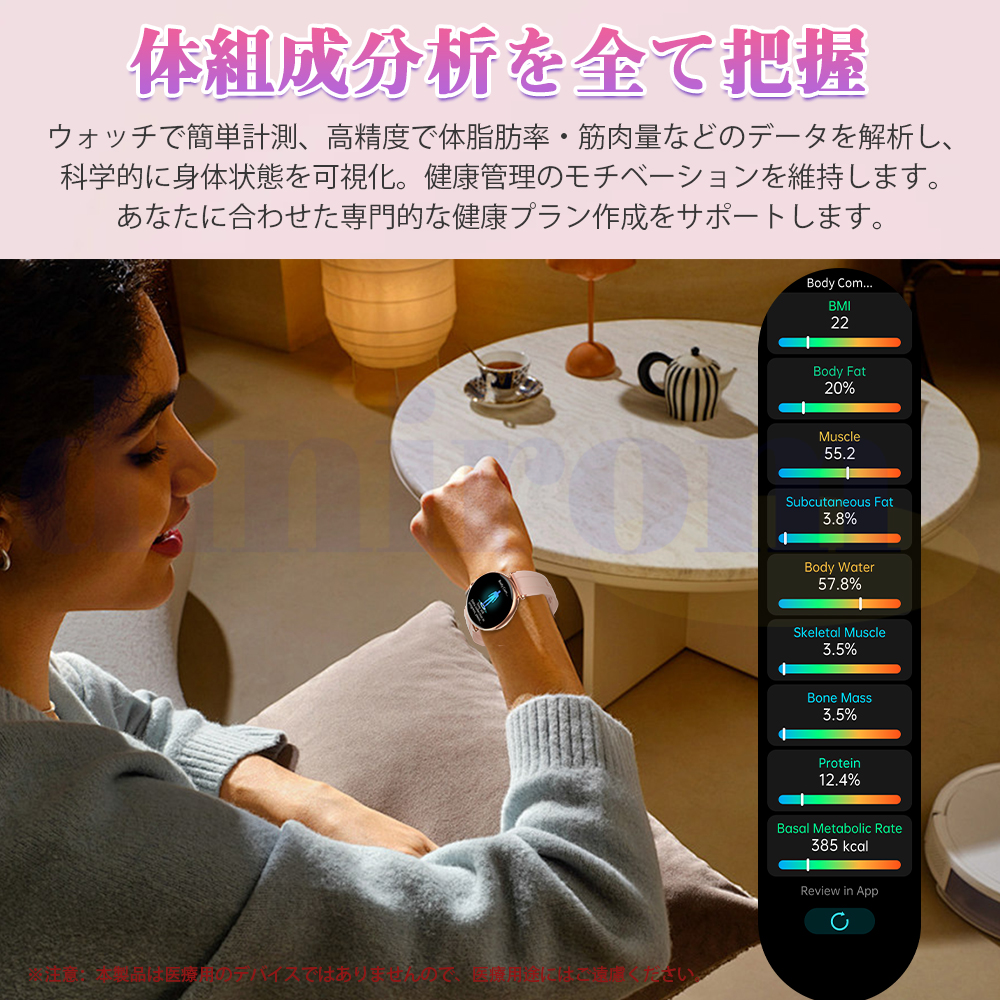 ●24H健康管理:体組成分析、健康値、血液成分分析、ECG+HRV心電図、血中脂質、尿酸、24時間体温監視、動態心拍数、アラート、24時間自動血圧測定、血中酸素、睡眠監視などの測定機能付き