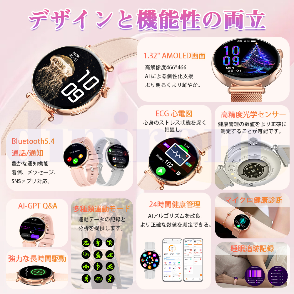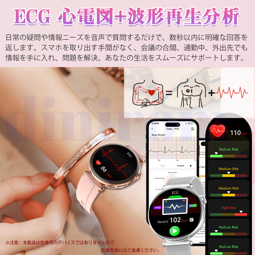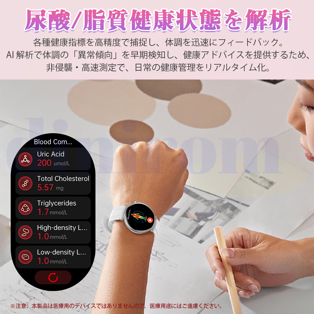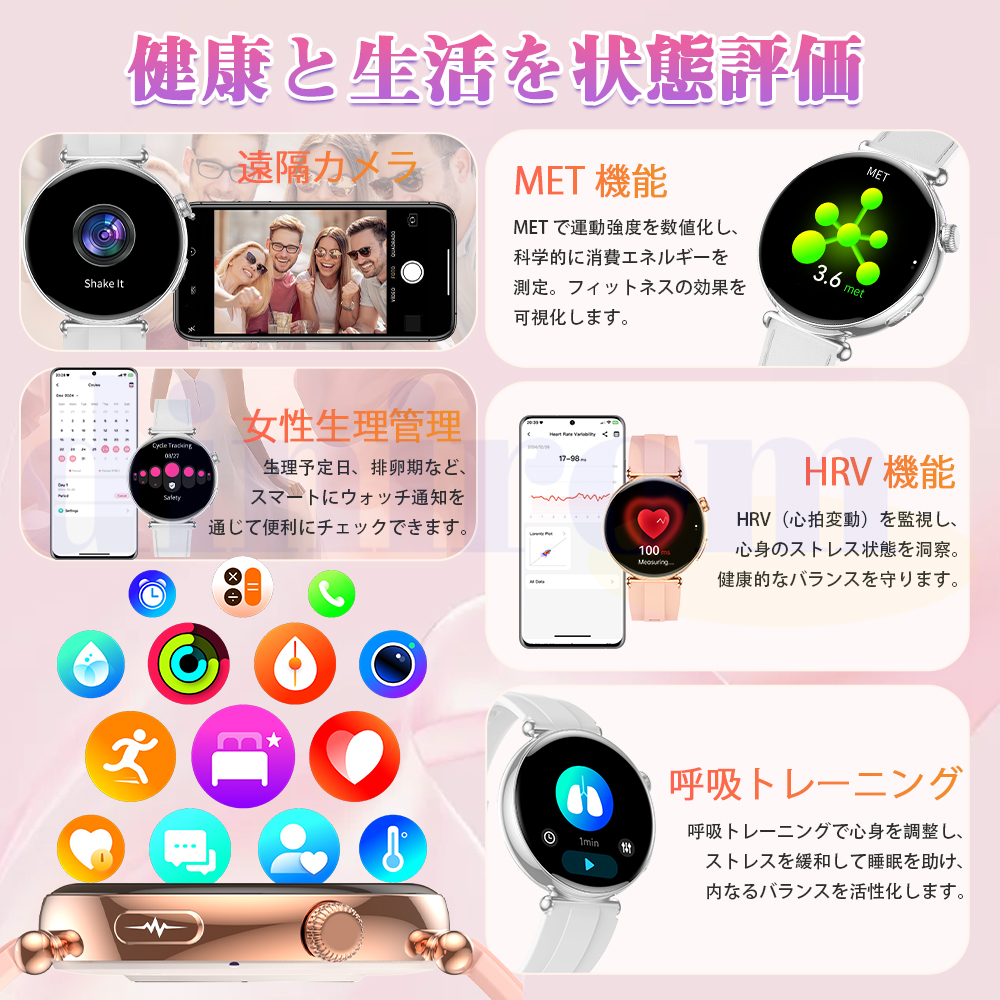 ●24H健康管理:体組成分析、健康値、血液成分分析、ECG+HRV心電図、血中脂質、尿酸、24時間体温監視、動態心拍数、アラート、24時間自動血圧測定、血中酸素、睡眠監視などの測定機能付き