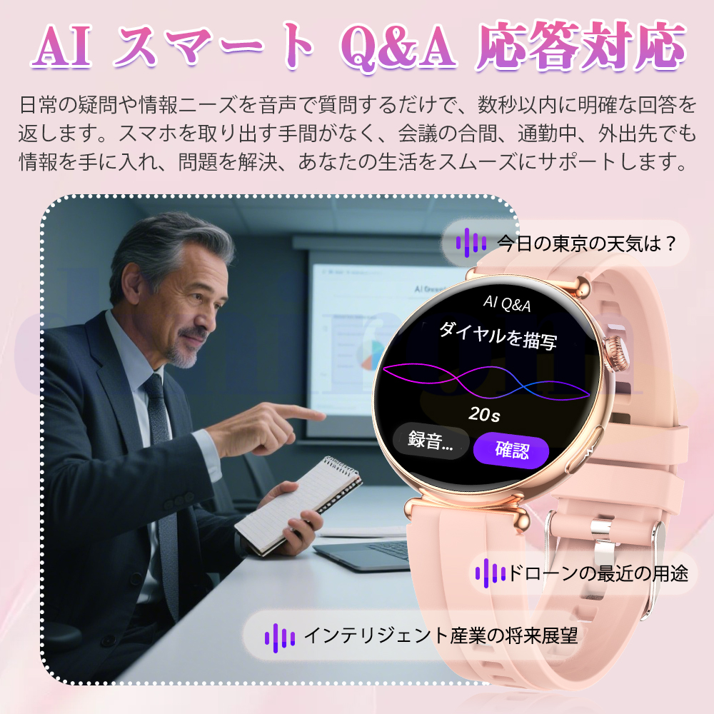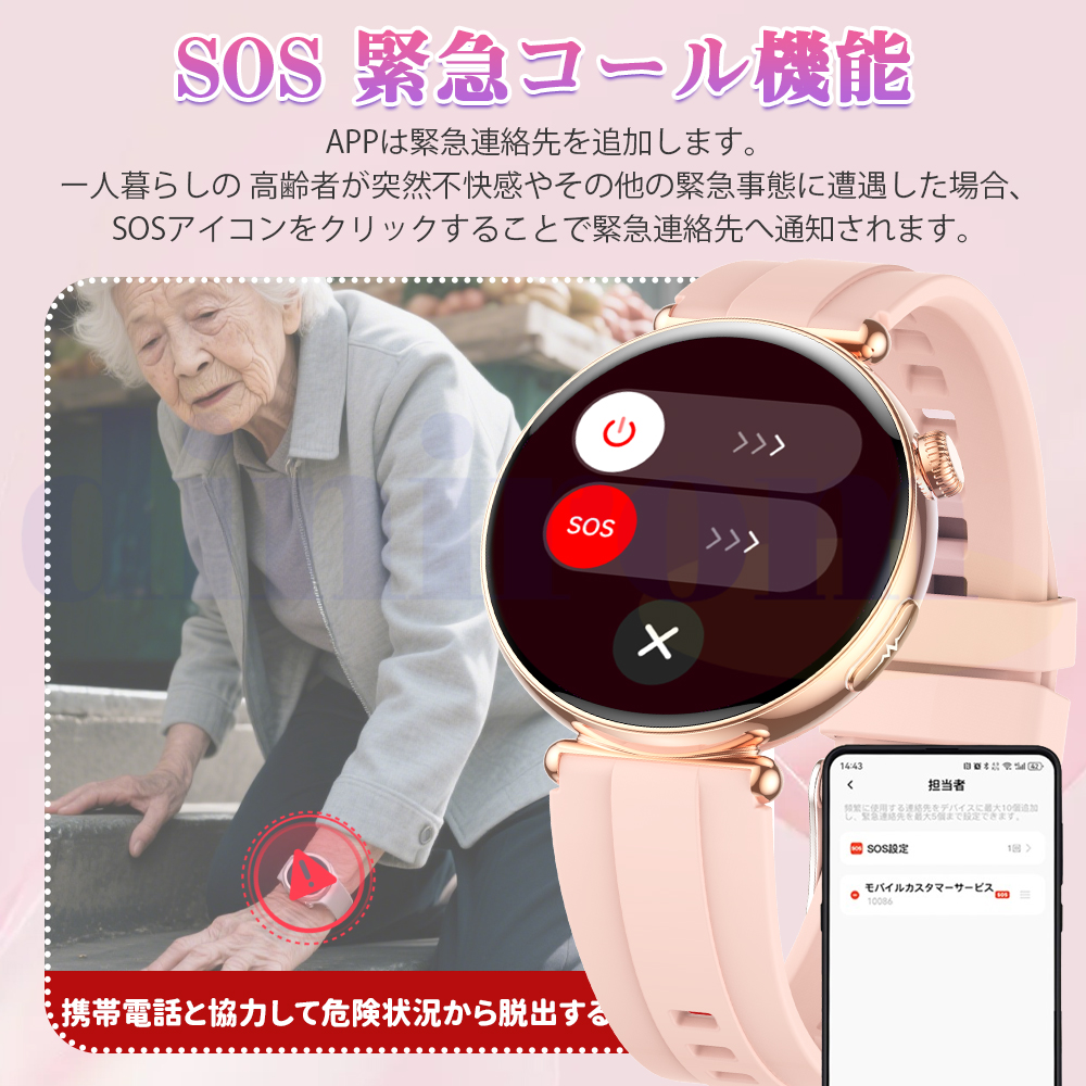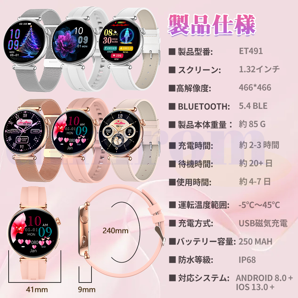 長い持ちの250mAhバッテリー搭載され、一回フル充電、機能全開の場合は、2-4日ほど持ちます。一部の機能がオンになっている場合、5~7日間の連続使用も問題なく、待機時間は最大約20日間です。頻繁に充電する手間が省けます。通知やBluebooth通話などの基本的なスマートウォッチ機能に加え、例えば、ストップウォッチ、カウントダウン、歩数計、カロリー、距離、睡眠監視、音声アシスタント、携帯検索、天気予報、音楽コントロール、名刺、電卓、カレンダー、多言語、遠隔カメラ、目覚まし時計、SOSなど、日常生活をより快適にする機能が搭載されています。ios13.0以上、android8.0以上のスマホに対応可能、さまざまシーンで使用できます。