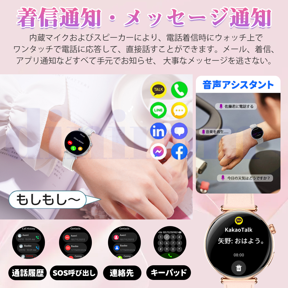 このスマートウォッチはBluetooth5.4を採用され、より高速、より安定した接続を実現します。スピーカー&高性能マイクが内蔵され、携帯電話を出さなくても、通話することができます。着信に応答または拒否することができます。更に電話をかけたり、通話履歴を表示したりすることができます。電話帳をあらかじめアプリ側に追加すれば、スマートウォッチ側の連絡先で表示できます。専用アプリ「G Band」の通知設定をONにすると、LINE、Twitter(X)、Facebookなどの通知は、スマートウォッチ振動でお知らせします。