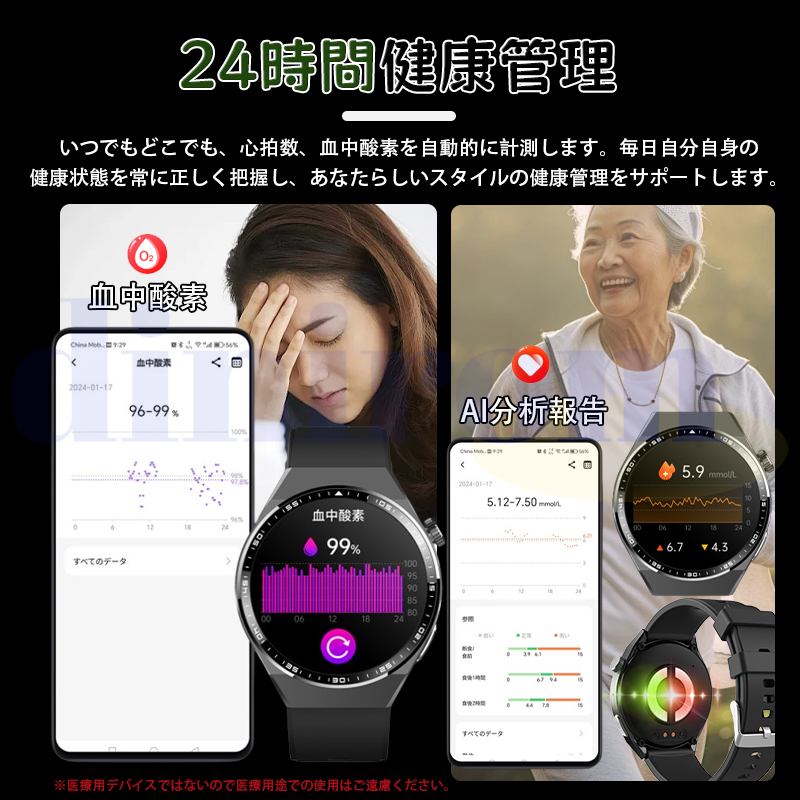 ●24H健康管理:ECG心電図、AI心電レポート分析、血液成分分析、体組成分析、心拍数異常警報、体温、24時間自動/手動血圧測定、心拍数、血中酸素、女性生理管理、睡眠監視やアラートなどの測定機能付き