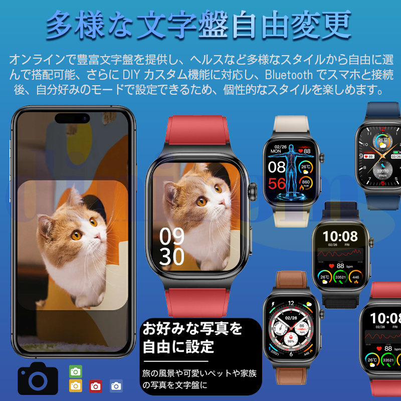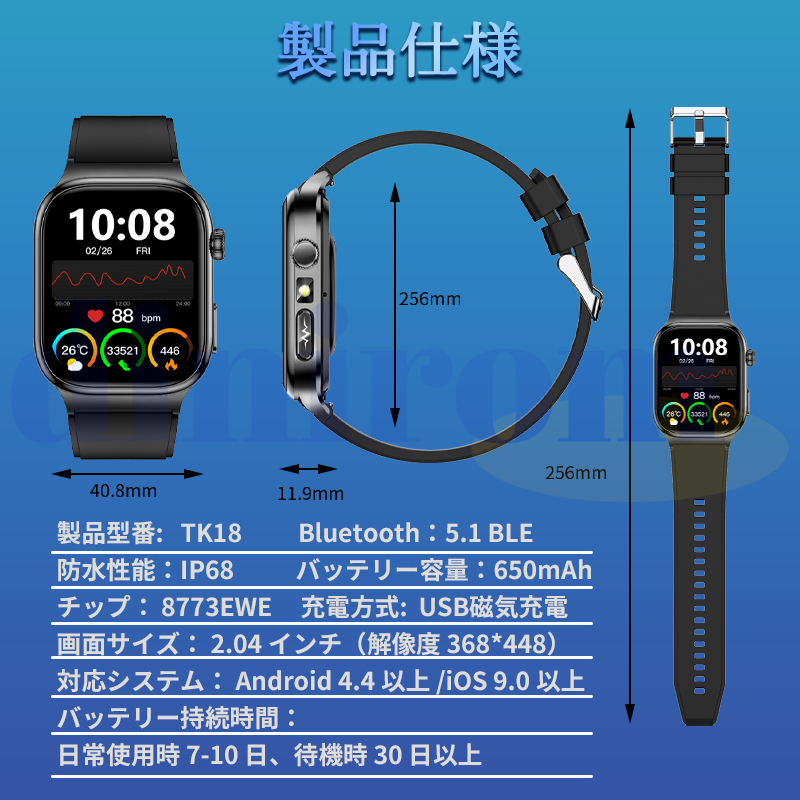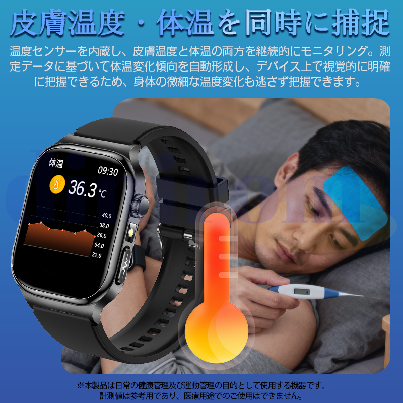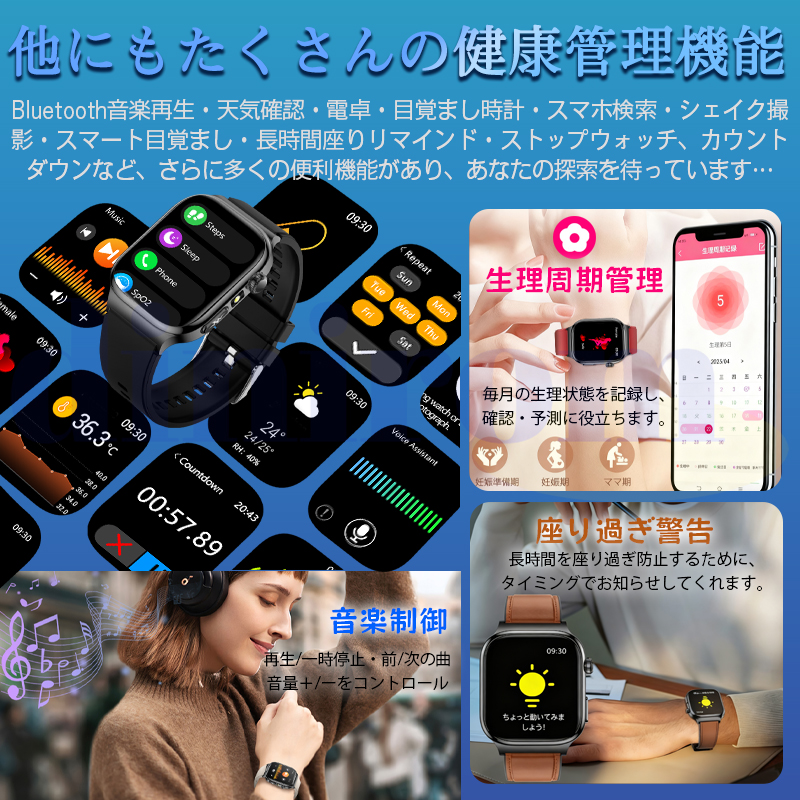 ●24H健康管理:血液成分、体組成分析、ECG心電図、24時間体温監視、血圧測定、血中酸素、睡眠監視や心拍数などの測定機能付き