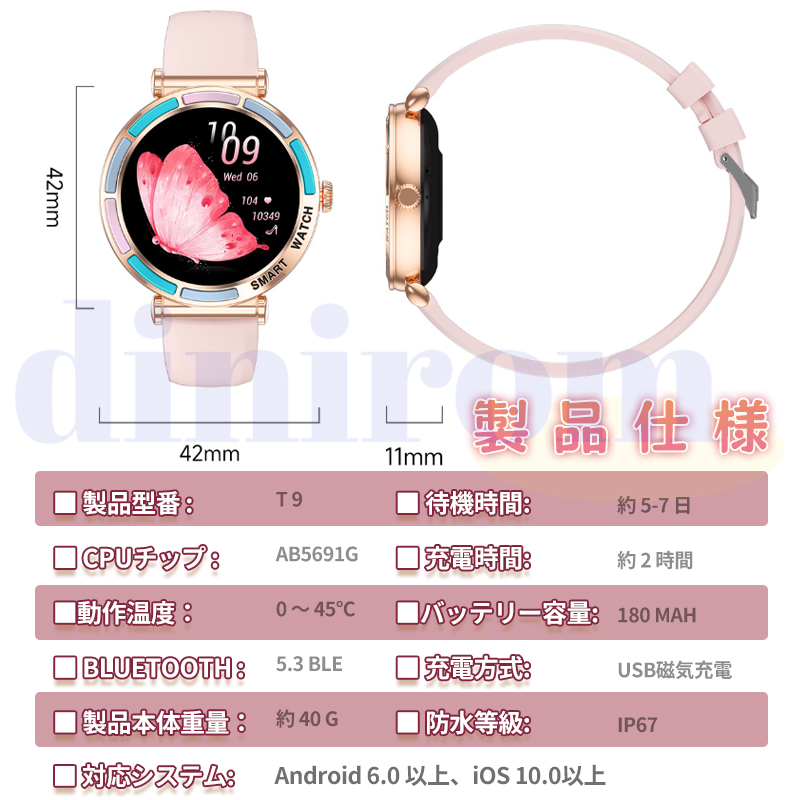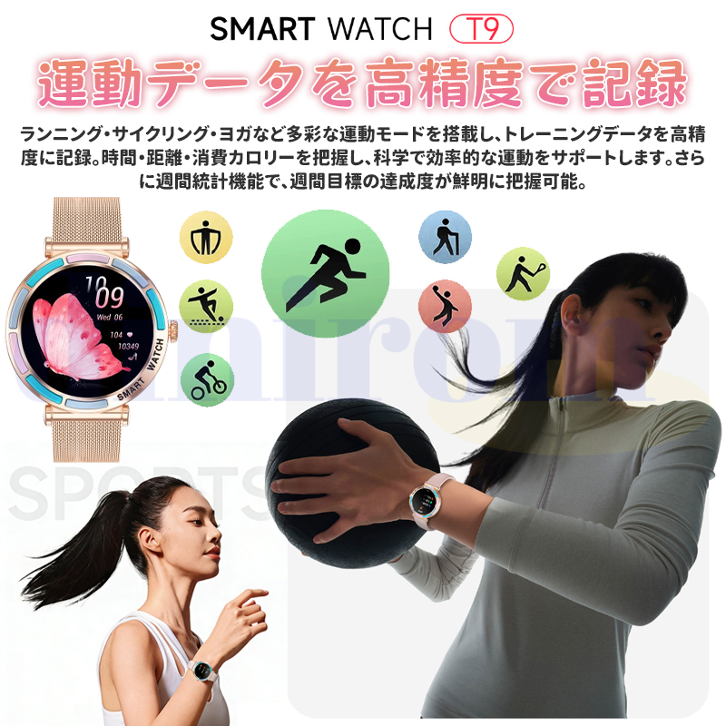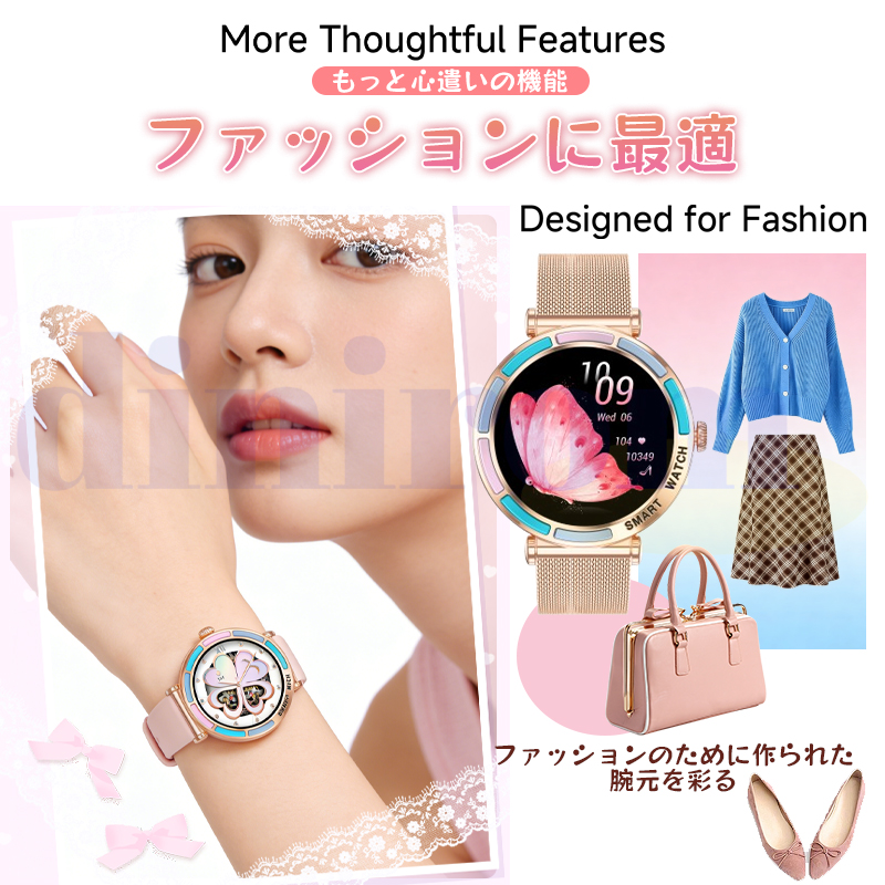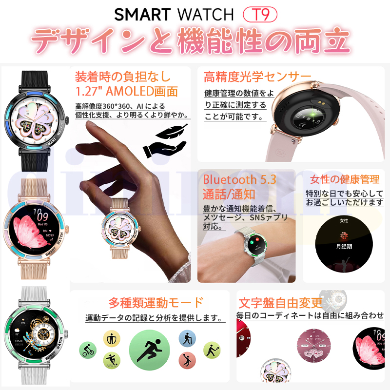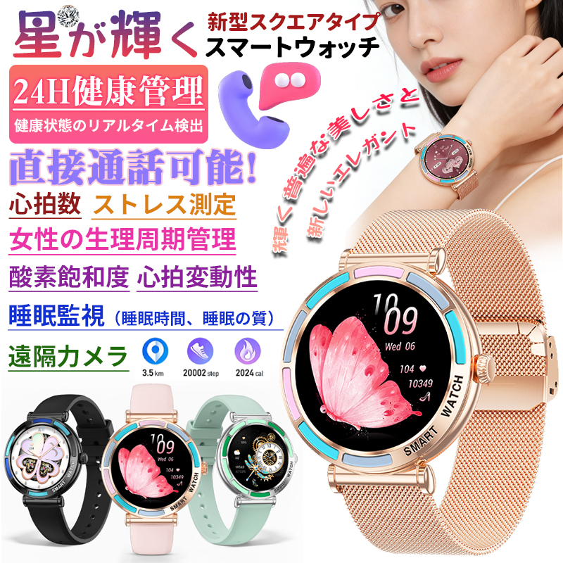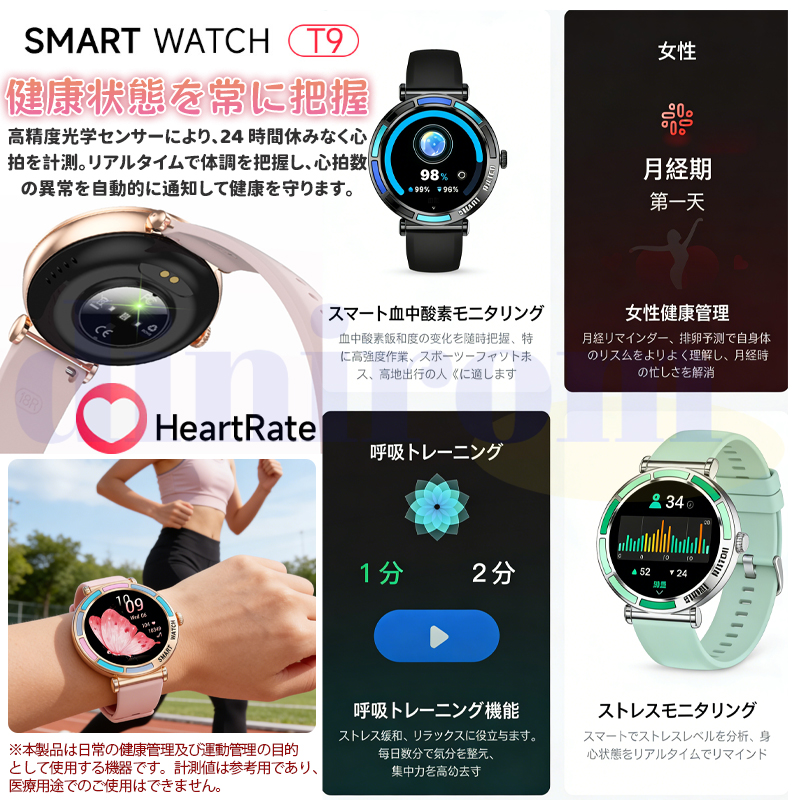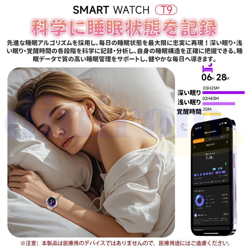 女性周期、カメラ、音楽制御、アラーム、着信通知、天気予報など日常生活に実用な機能満載!24時間健康管理、血圧、血中酸素、心拍数などご自分に関わる機能搭載されており、常に気を配り、状況を詳しく把握することができます。また睡眠時間や睡眠の質を正確に計測できる、意識的にスケジュールや習慣などを改善します。