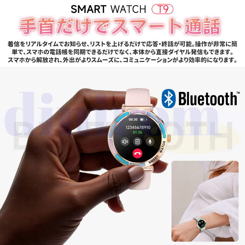 革新技術によって低消費&エネルギーチップとBluetooth 5.3通話機能を搭載し、ウォッチを使って電話に出たり、直接電話をかけたりできます。運転、家事、運動中で両手を解放し、より便利に〜また、音声アシスタント対応可能で、スマホを出さなくても、スマートウォッチの 音声アシスタント画面でSiriを呼び出し、すごく便利。着信履歴のチェック、連絡先登録、ダイヤルパッド付き、運転中、運動中などスマホをすぐに取り出せない状況でも大事な着信を逃しません。また専用アプリに連絡先を追加すると、ウォッチで追加したリストを表示され、リストから電話もかけます。天気予報、女性の生理、音楽制御、ストレステスト、スマホを探す、長居注意、呼吸訓練、懐中電灯、スマートストップウォッチ、電卓などの各種ユーティリティが付属しており、日常生活を便利にします。