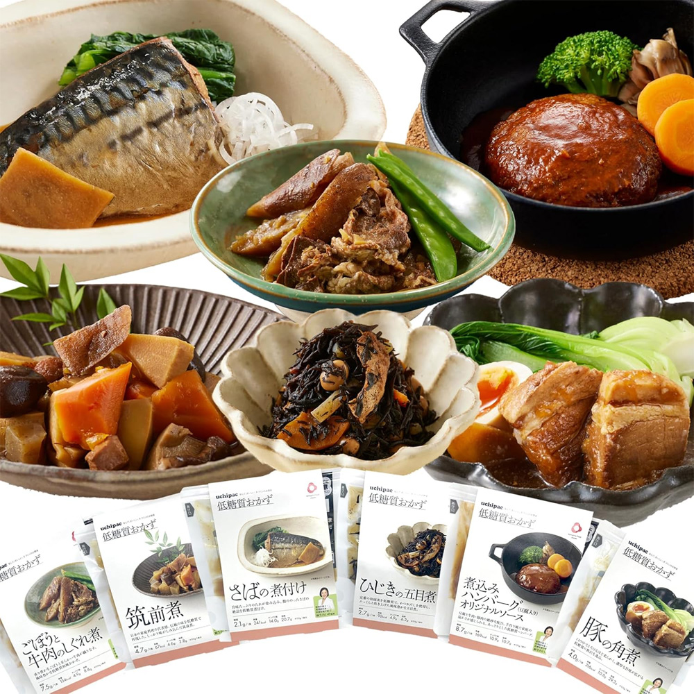 煮込み豆腐入ハンバーグ、さばの煮付け、豚の角煮、ごぼうと牛肉のしぐれ煮、筑前煮、ひじきの五目煮、合計6品目各種1袋