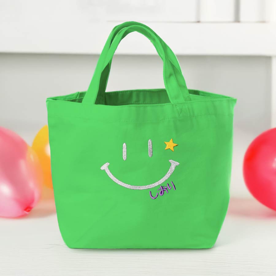 刺繍 トートバッグ 名入れ ニコちゃんマーク 自立する バック キャンバス生地 弁当 ランチ 着替え お母さん 母 お父さん 父 耐久性 こども 刺しゅう 小さめ