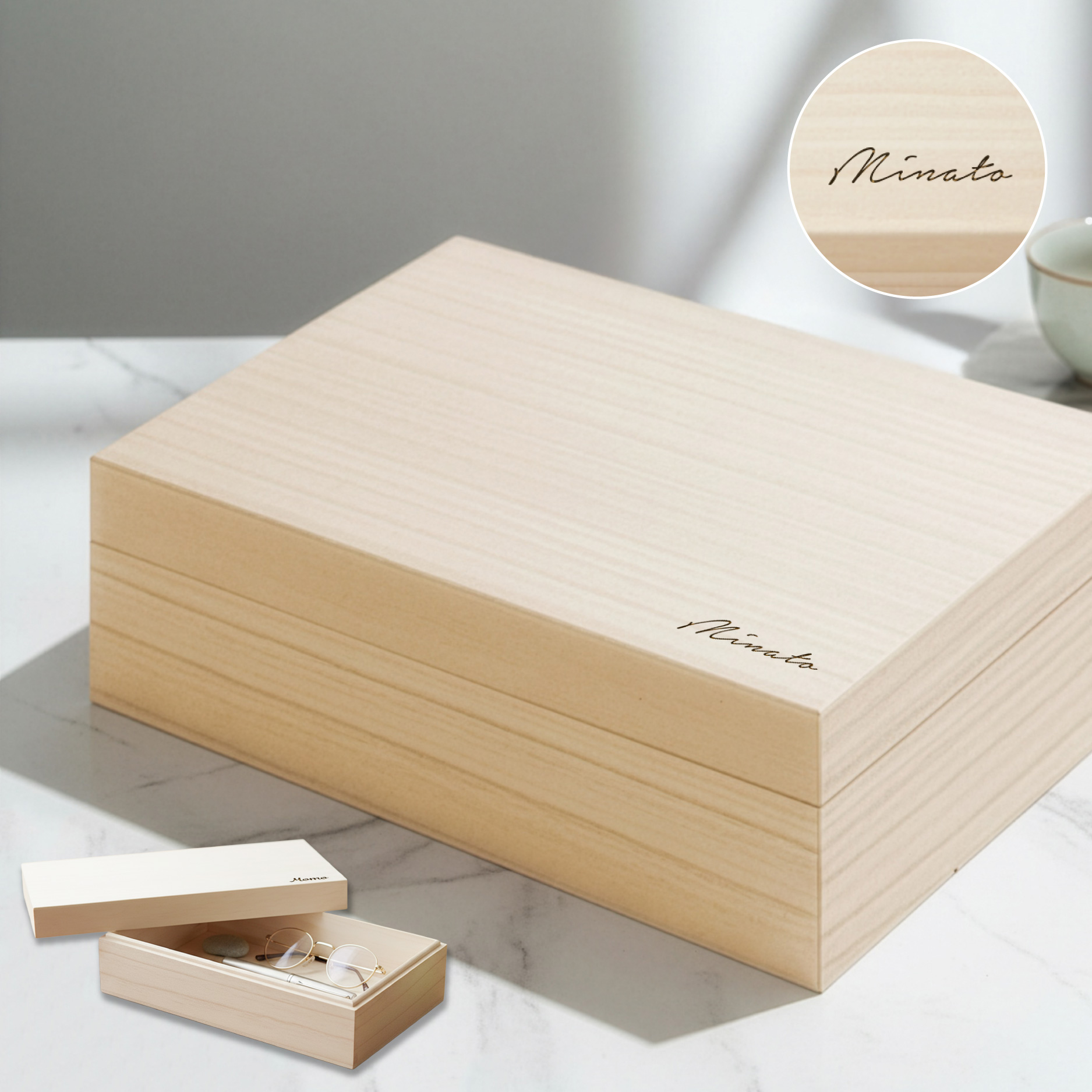 世界にひとつの桐製小物入れ。蓋にお名前やイニシャルをレーザー加工で刻印します。