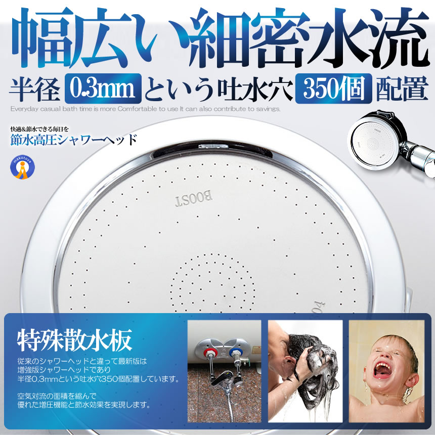 80%節水&節約極細穴で少量の水でも勢いのある水流に!手元にワンタッチ止水ボタンが付いてボダンを押すだけで水を止める事ができます。水道代はもちろん同時に電気代やガス代の節約も可能です。増圧散水板の効果でシャワーの勢いがアップ3段階水量モードで異なるシャワー心地が楽しめる3つの吐水モード水圧を自由に調節可能。好みや用途に合わせてソフト水流とハード水流を選べます。手元ストップで止水と通水をワンタッチで切り替え可能です。ヘッドが上下60度&左右360度回転するシャワーヘッド半径0.3mmという吐水穴350個配置しています。&高品質のシャワーヘッド