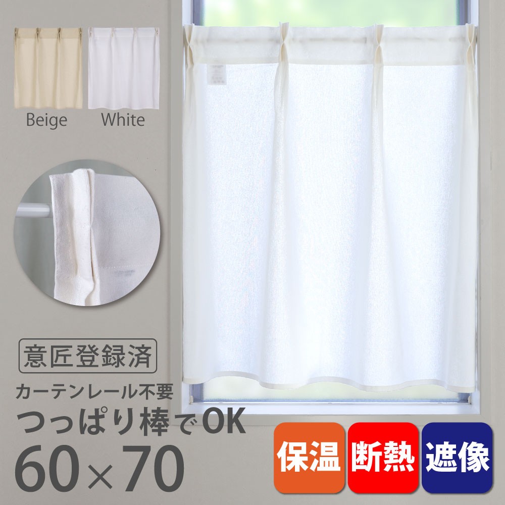 タックカフェカーテン コトン 60cm幅×70cm丈 1枚入 無地 保温 断熱 遮像 天然素材 綿 コットン 小窓 細窓 縦長