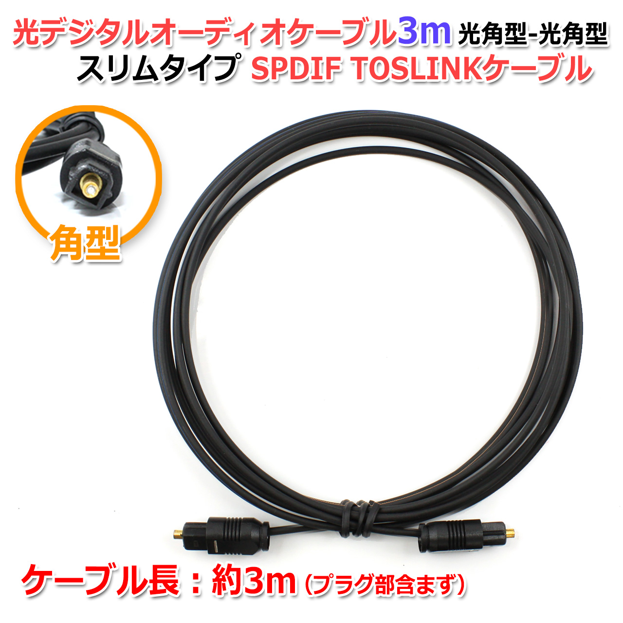 両端が角型端子となっている、ケーブル長3mの光オーディオケーブルです。