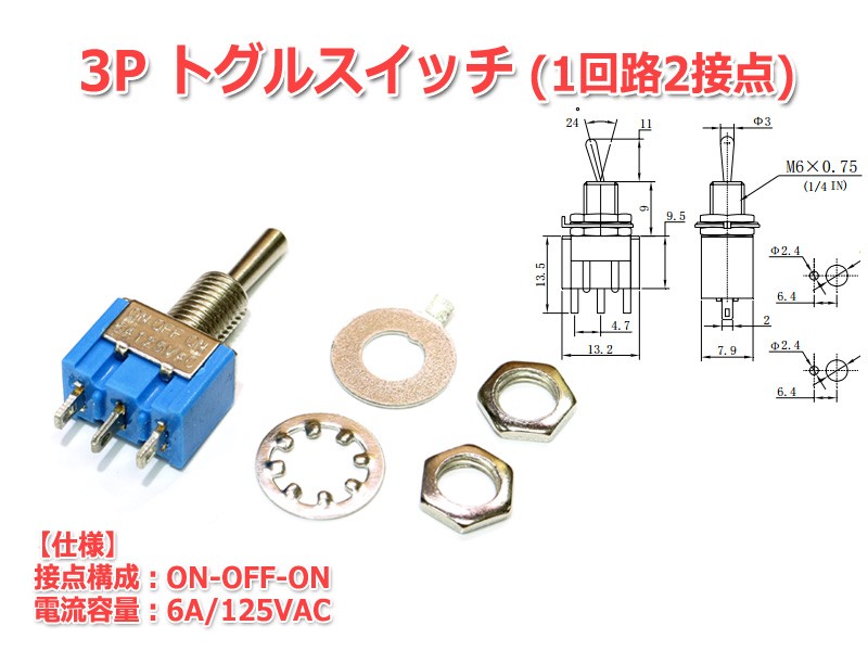 汎用3P(1回路2接点)ON-OFF-ONトグルスイッチです。
