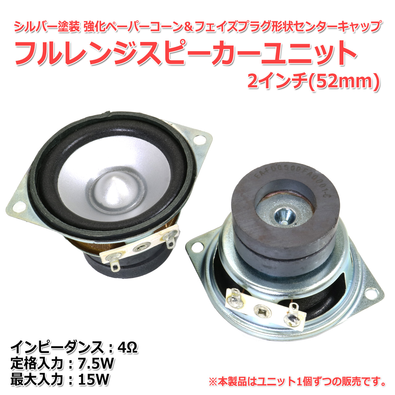 シルバー塗装強化ペーパーコーンに、フェイズプラグ形状センターキャップが特徴的な外観のフルレンジスピーカーユニット2インチ(52mm) 4Ω/MAX15Wです。