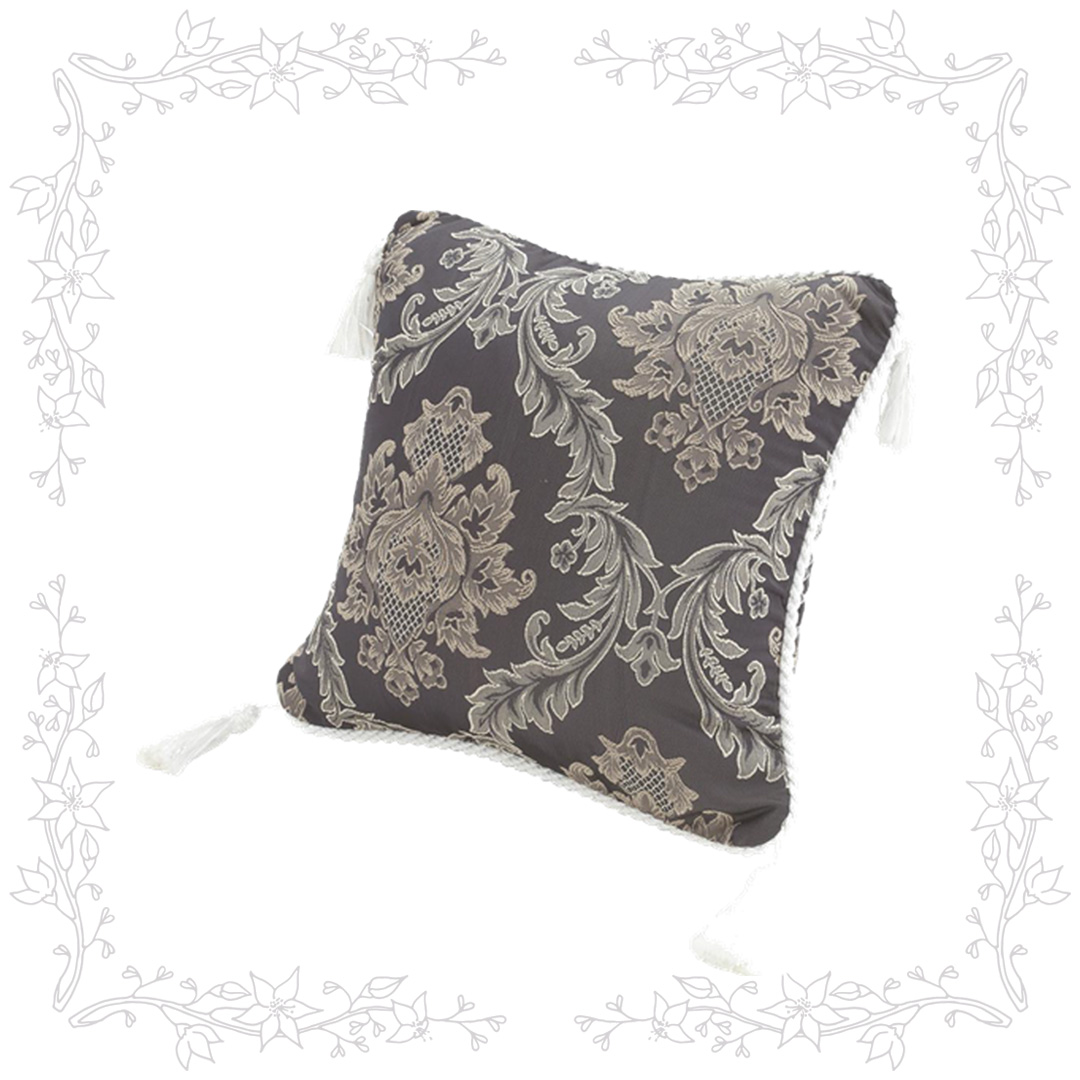 ニュアンスのあるグレーにエレガントなパターンが上品なクッションカバー。