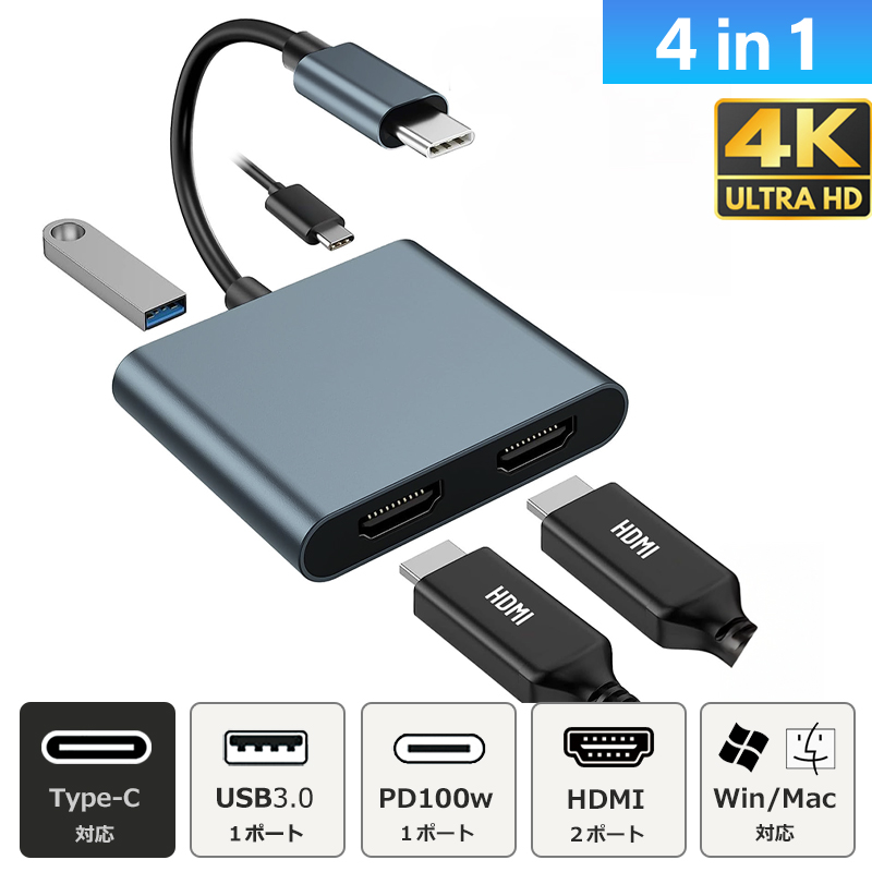 USB C to HDMI 4K x2 変換アダプタ ハブ 4in1 USB3.0 対応 hub 高解像度 タイプC モニター マルチディスプレイ PD usbハブ スマホ MacBook iphone Android PC