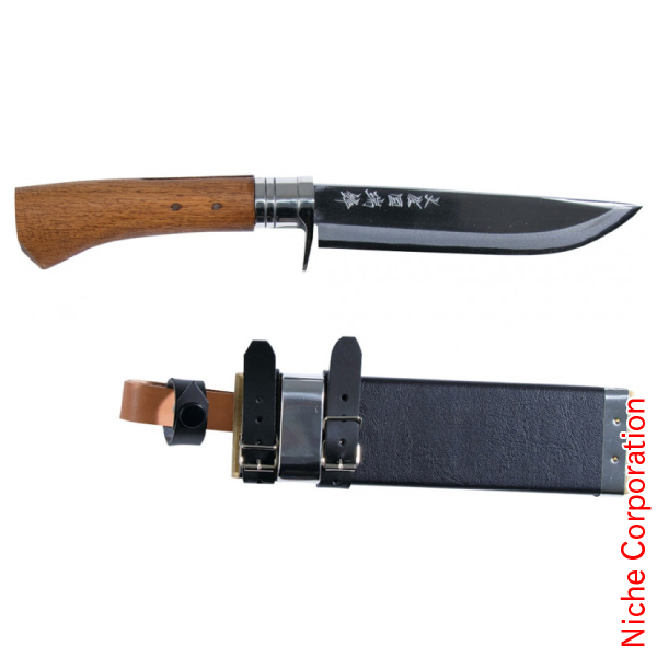 耐摩耗性に優れ粘り強い青紙2号を割り込んだ刀身、携行性の良い革鞘と、使用後の保管を兼ねた木製鞘をお選びいただけます。