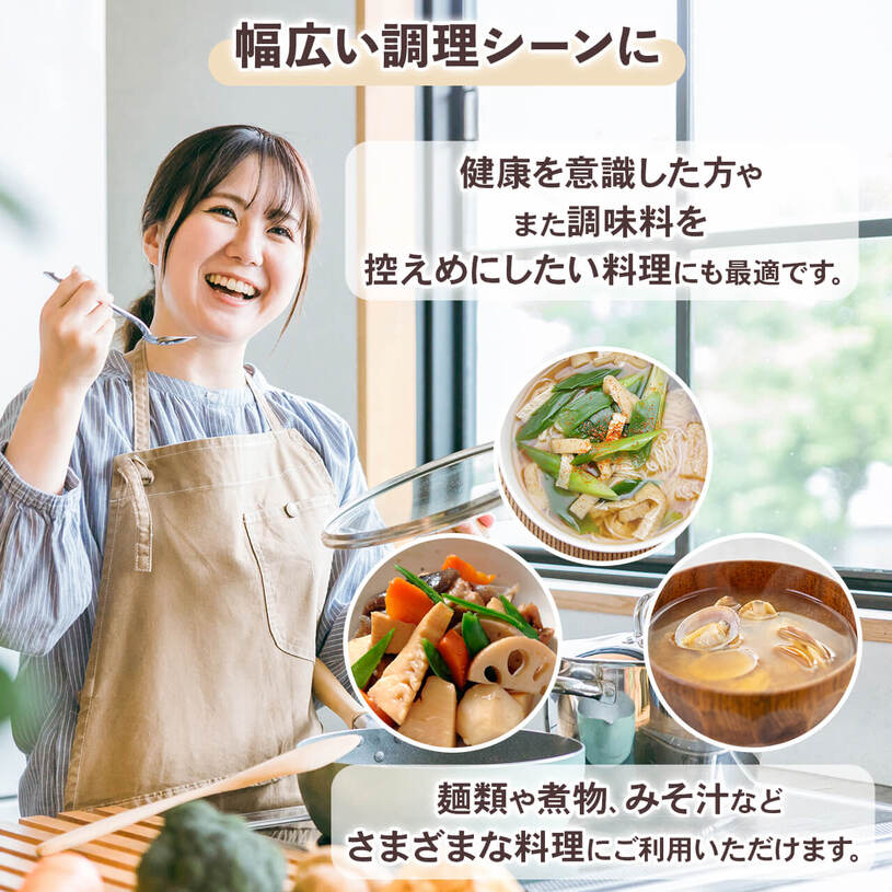 | お召し上がり方 | 麺類、 煮物、みそ汁、おでんなどの比較的濃い味を求める料理におすすめです。 |