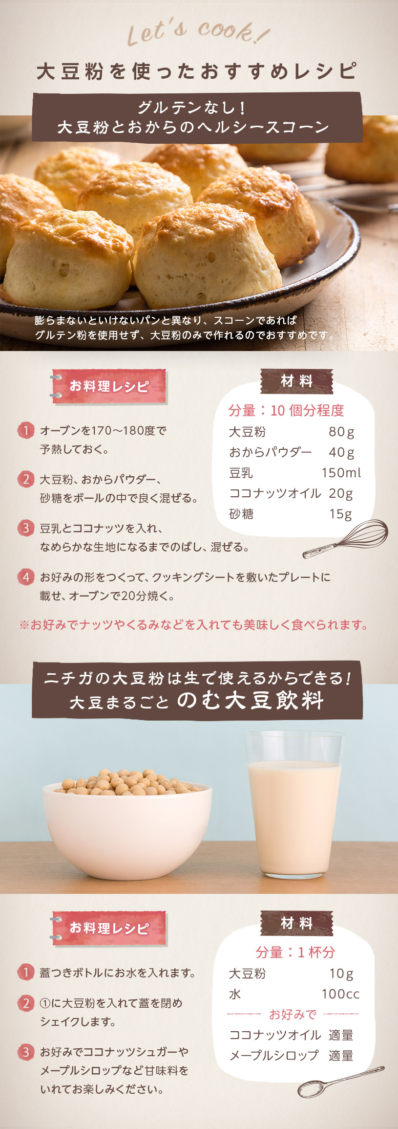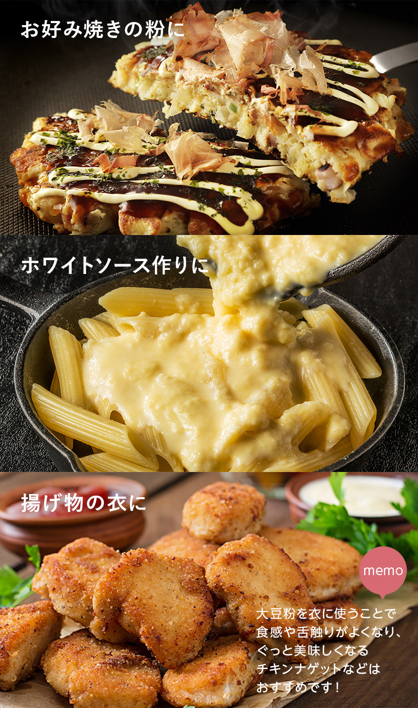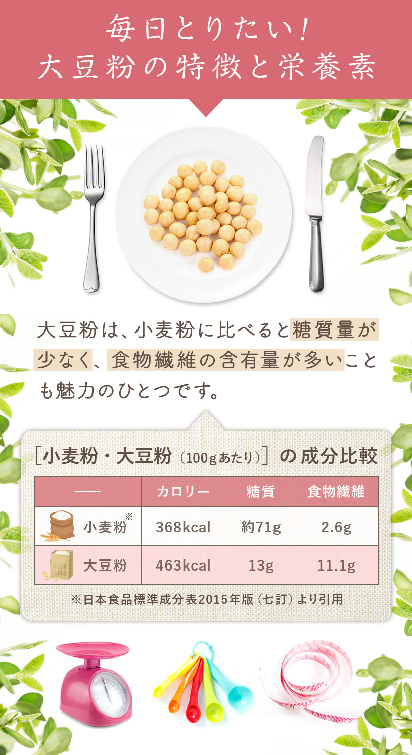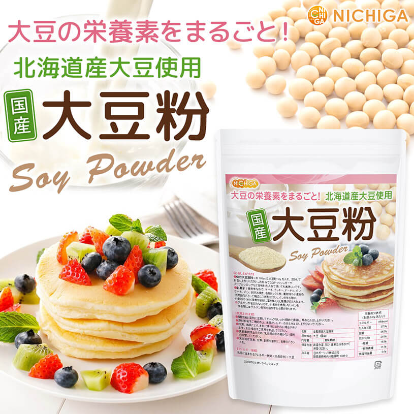| お召し上がり方 | 【のむ大豆飲料】 水100ccに大豆粉10gを入れ、溶かしてお召し上がりください。 お好みでココナッツシュガーやメープルシロップなど甘味料を入れて頂いても美味しいです。 【お菓子】 微粉末なので、ケーキ、クッキー、ドーナツ、パンケーキ、パン、お好み焼き、各種ミックス粉、製菓材料や小麦粉の代用品などとして幅広くご使用下さい。 パンを作る際は、小麦粉の30%程度を目安に置き換えると糖質が抑えられます。 ※グルテンが含まれないので、小麦粉を使用しないパンを作る際にはグルテン粉等を追加する必要があります。 |