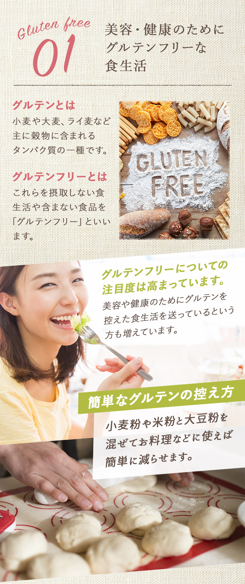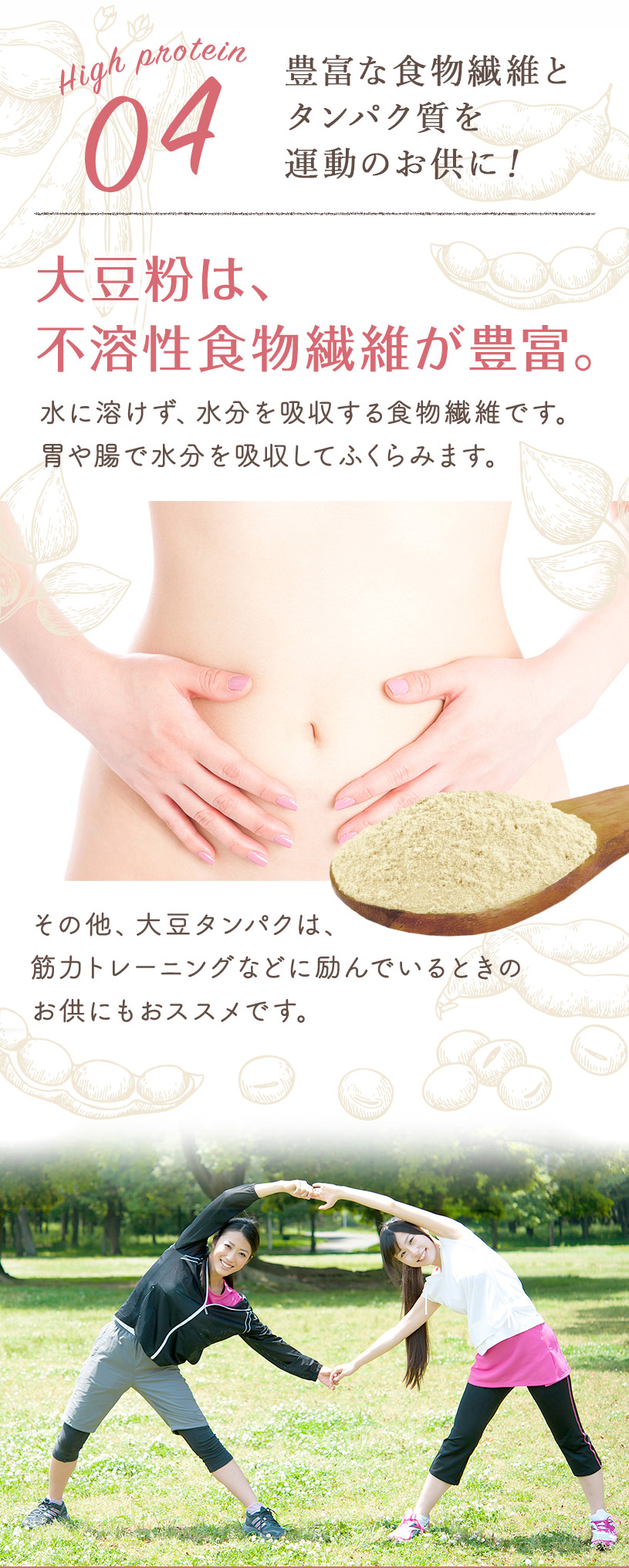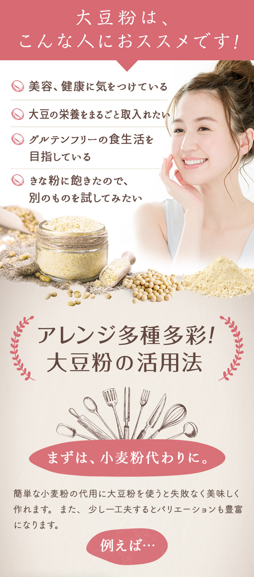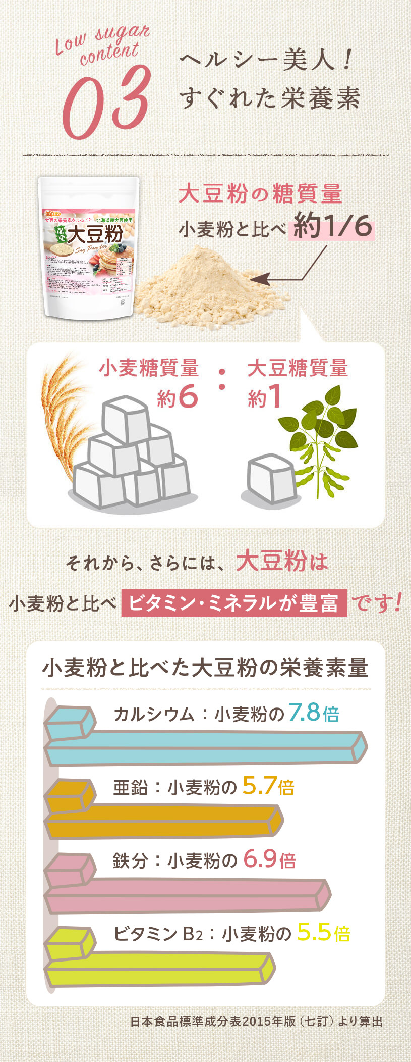 | お召し上がり方 | 【のむ大豆飲料】 水100ccに大豆粉10gを入れ、溶かしてお召し上がりください。 お好みでココナッツシュガーやメープルシロップなど甘味料を入れて頂いても美味しいです。 【お菓子】 微粉末なので、ケーキ、クッキー、ドーナツ、パンケーキ、パン、お好み焼き、各種ミックス粉、製菓材料や小麦粉の代用品などとして幅広くご使用下さい。 パンを作る際は、小麦粉の30%程度を目安に置き換えると糖質が抑えられます。 ※グルテンが含まれないので、小麦粉を使用しないパンを作る際にはグルテン粉等を追加する必要があります。 |